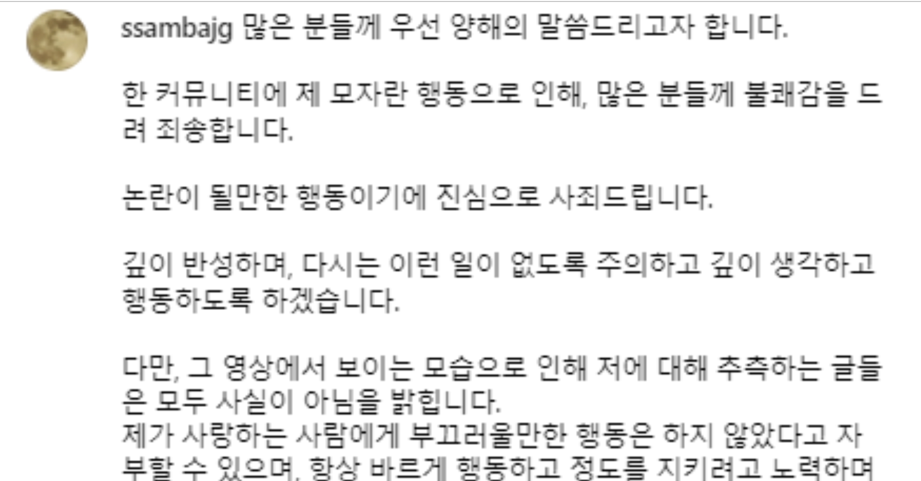 이에 상철은 "논란이 될 만한 행동이었기 때문에 진심으로 사죄드린다며 깊이 반성하며 다시는 이런일이 없도록 주의하고 깊이 생각하고 행동하겠다고 사과문을 올리기도 했습니다.