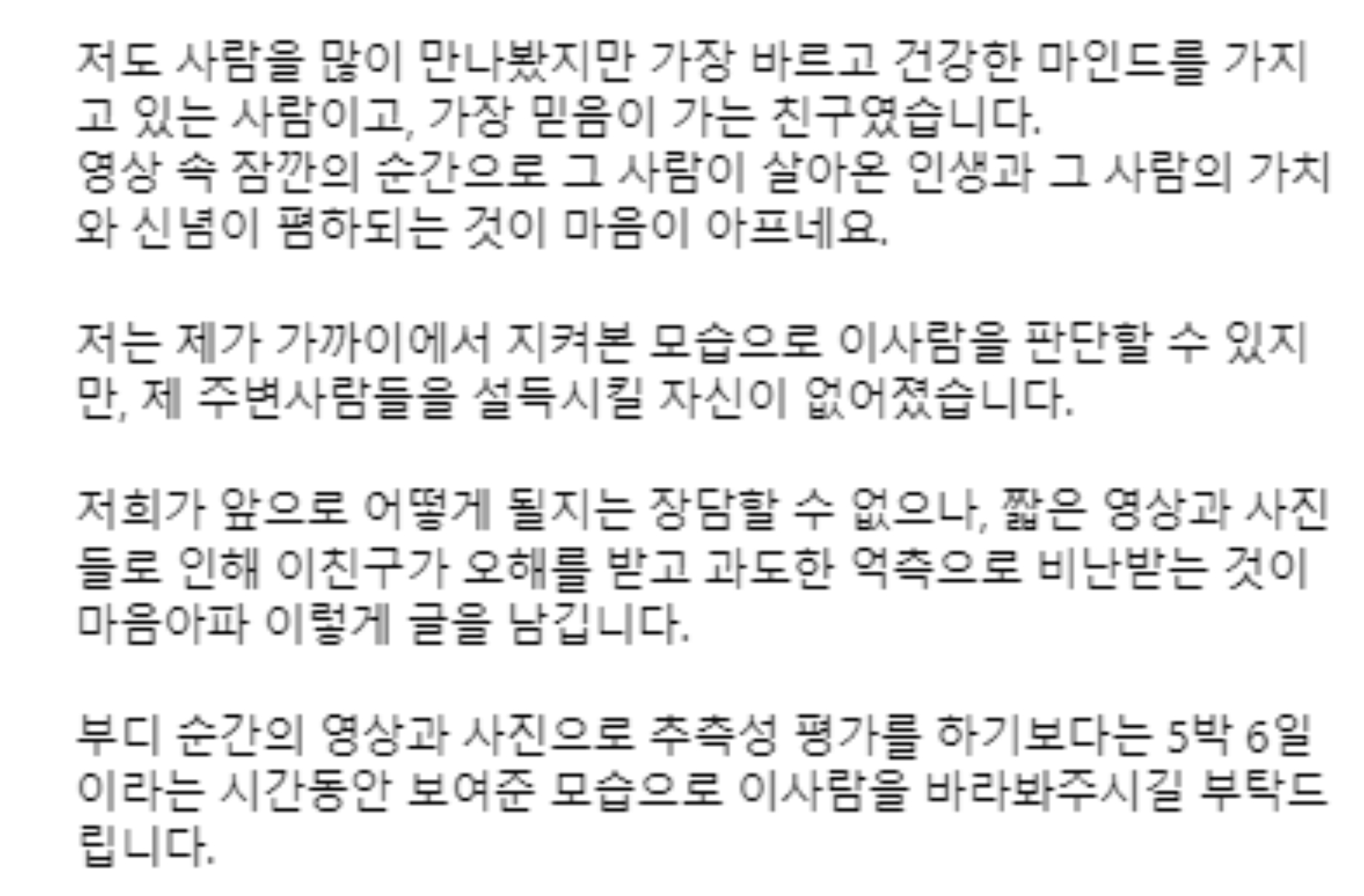 이에 현숙은 "순간의 영상과 사진으로만 추측성 평가를 하지 말고 5박 6일동안 보여준 상철의 모습으로 바라봐주길 부탁드린다"고 당부했습니다.