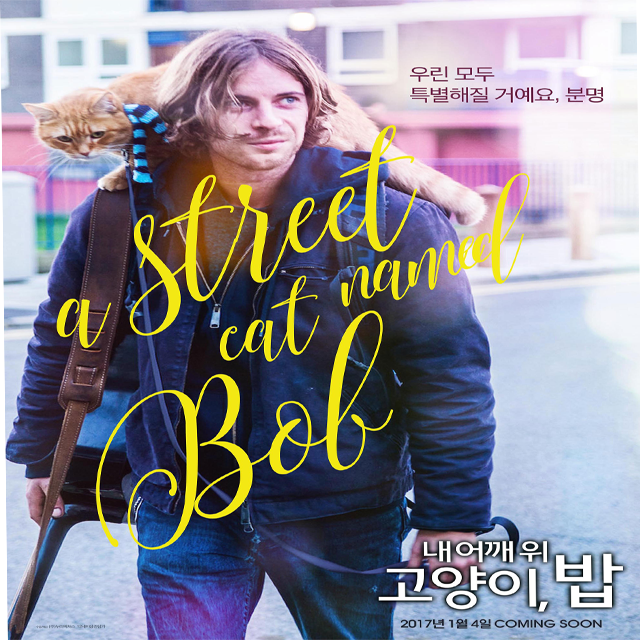 내 어깨 위 고양이, 밥 이 영화는 약물 중독에 가족에게까지 버림받고 거리 생활을 하던 주인공이 고양이, 밥을 만나면서 위안을 얻고 교감을 통해 그의 삶을 의미 있게 되찾아주는 마음이 따뜻해지는 힐링 영화입니다.