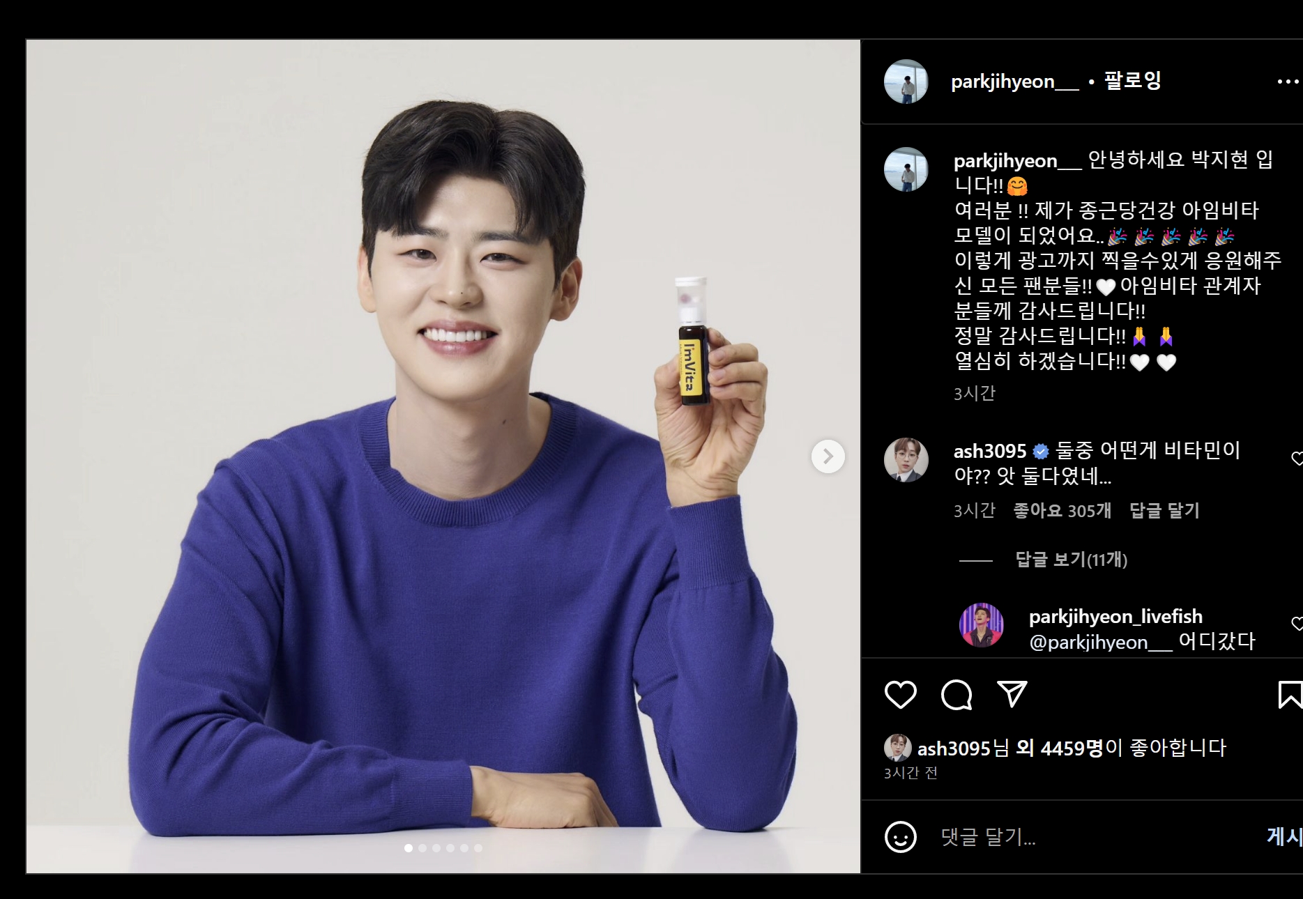 가수 박지현이 인스타에 비타민 광고에 대한 소식을 올렸습니다!