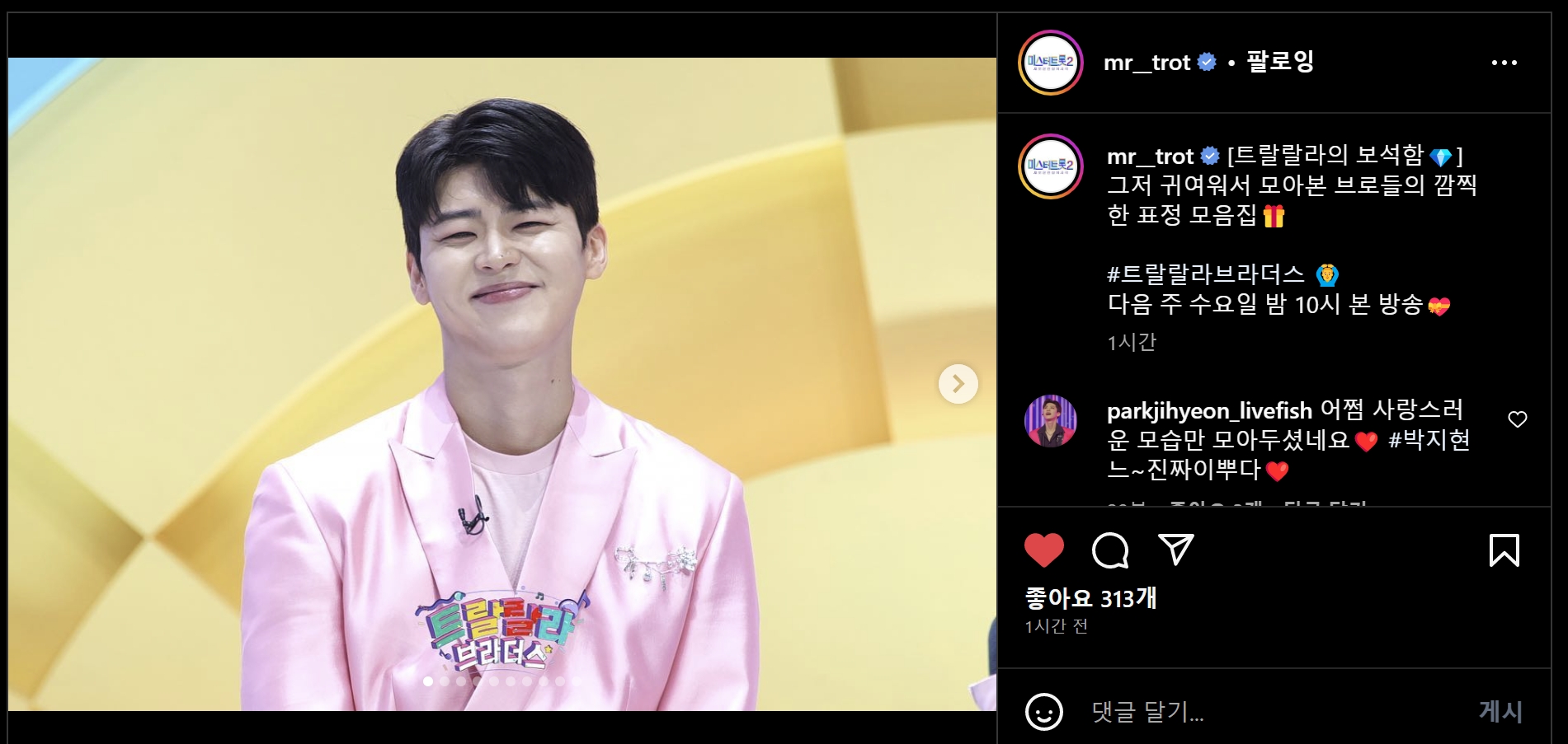 미스터트롯 인스타에서 <트랄랄라의 보석함>그저 귀여워서 모아본 브로들의 깜찍한 표정 모음집이란 글과 함께 사진을 올려주었습니다