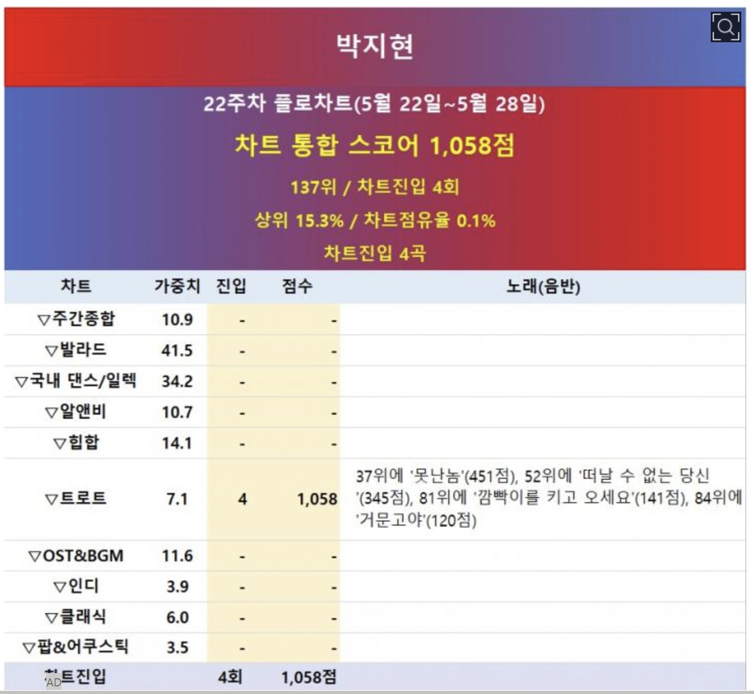 신인 가수임에도 박지현의 차트스코어는 1,058점, 차트점유율은 0.1%로 차트에 진입한 426명(팀)의 아티스트 중에서 137위를 차지하면서 화제가 되고 있습니다