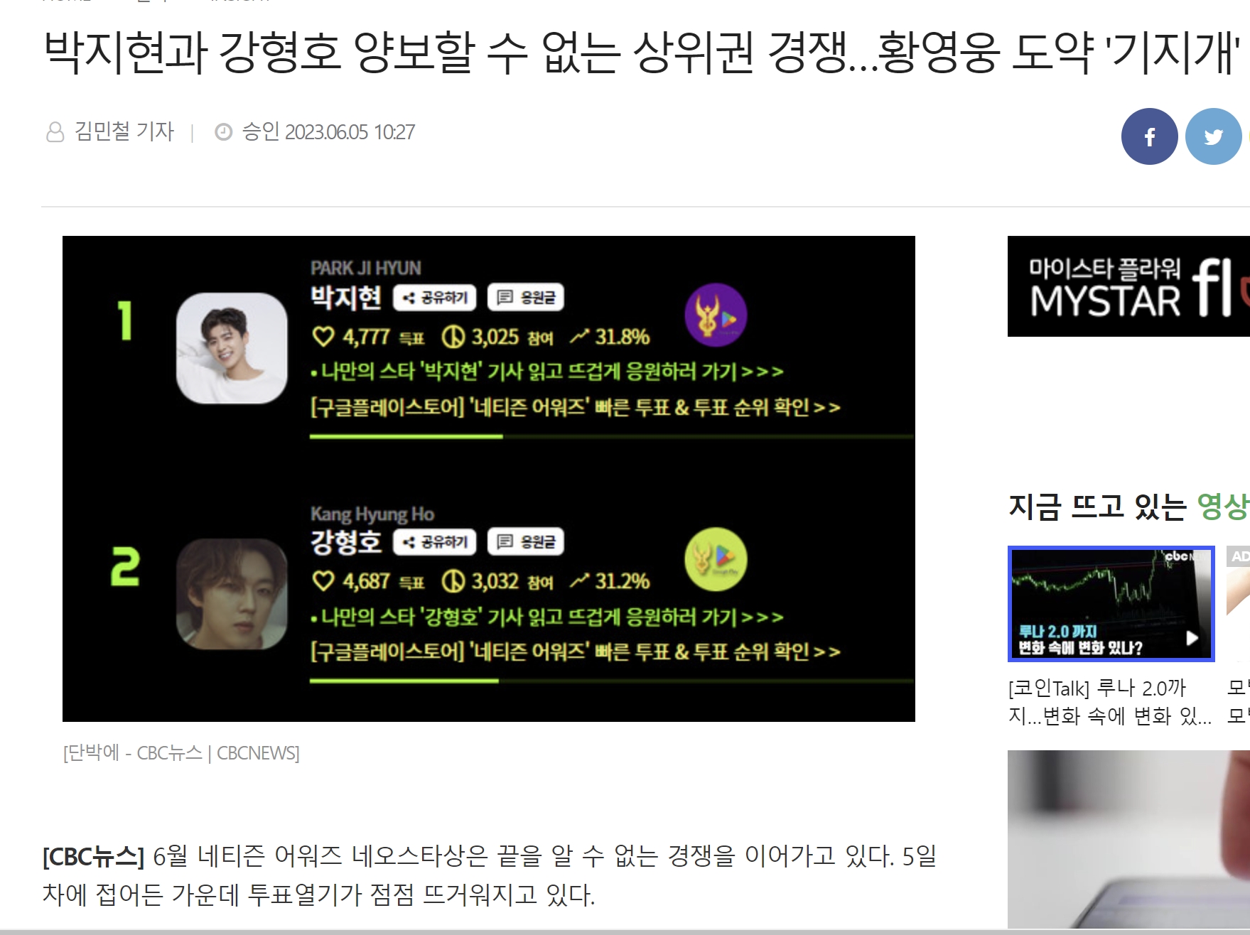 세 번째 기사는 얼마전 5월 네티즌 어워즈 네오스타상에서 1위를 차지한 박지현이 현재 진행 중인 6월 네오스타상에서도 1위를 유지하고 있지만 그 경쟁이 치열하다고 합니다.