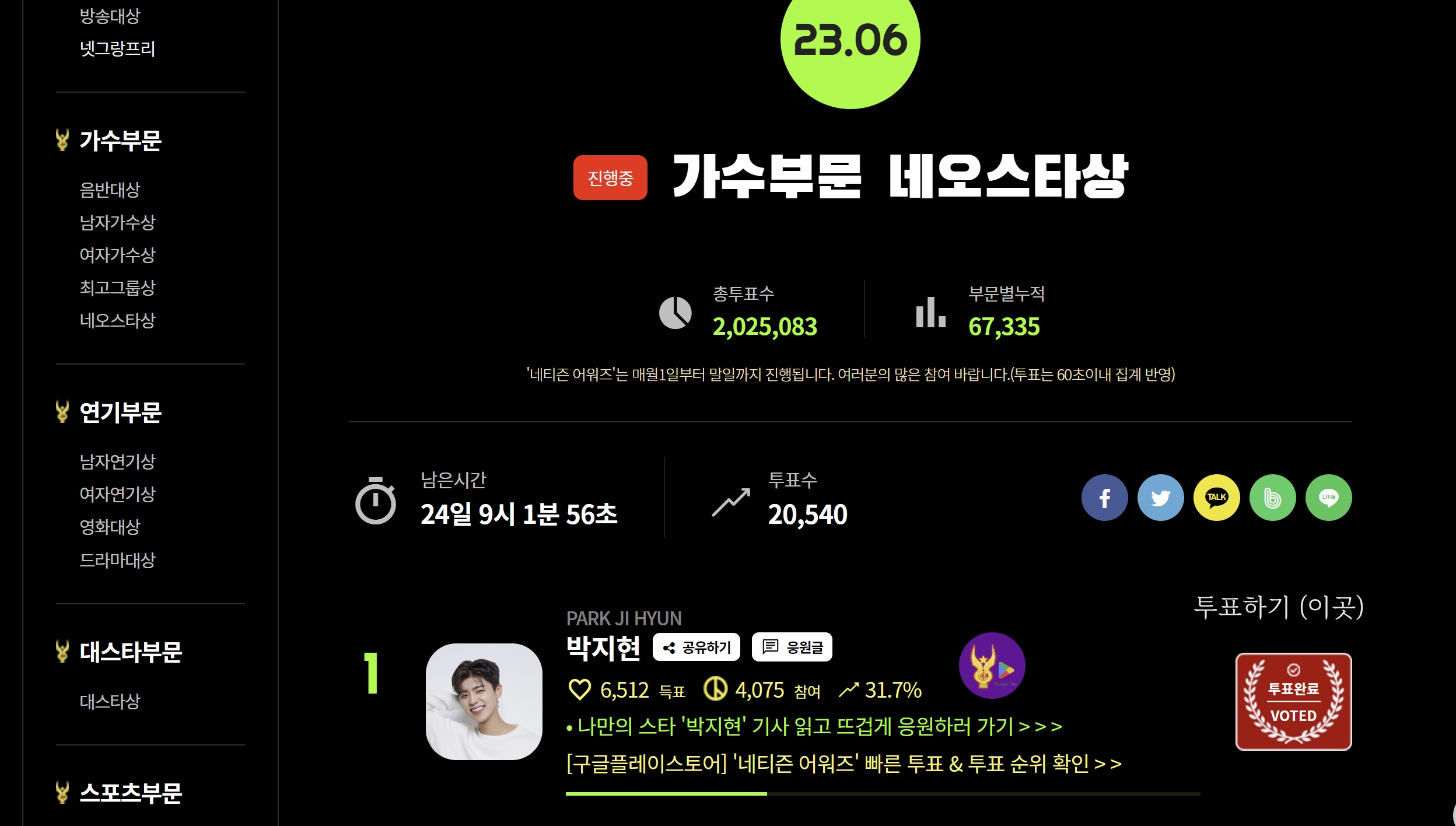 투표 방법은 플레이 스토어에 '네티즌어워즈 '앱을 깐후 투표가 가능하고 네이버에 검색 '네티즌어워즈'들어오셔서 네오스타상 클릭 (회원가입:네이버로 로그인으로 간단히 가능) 박지현에게 투표하기 클릭하시면 됩니다
