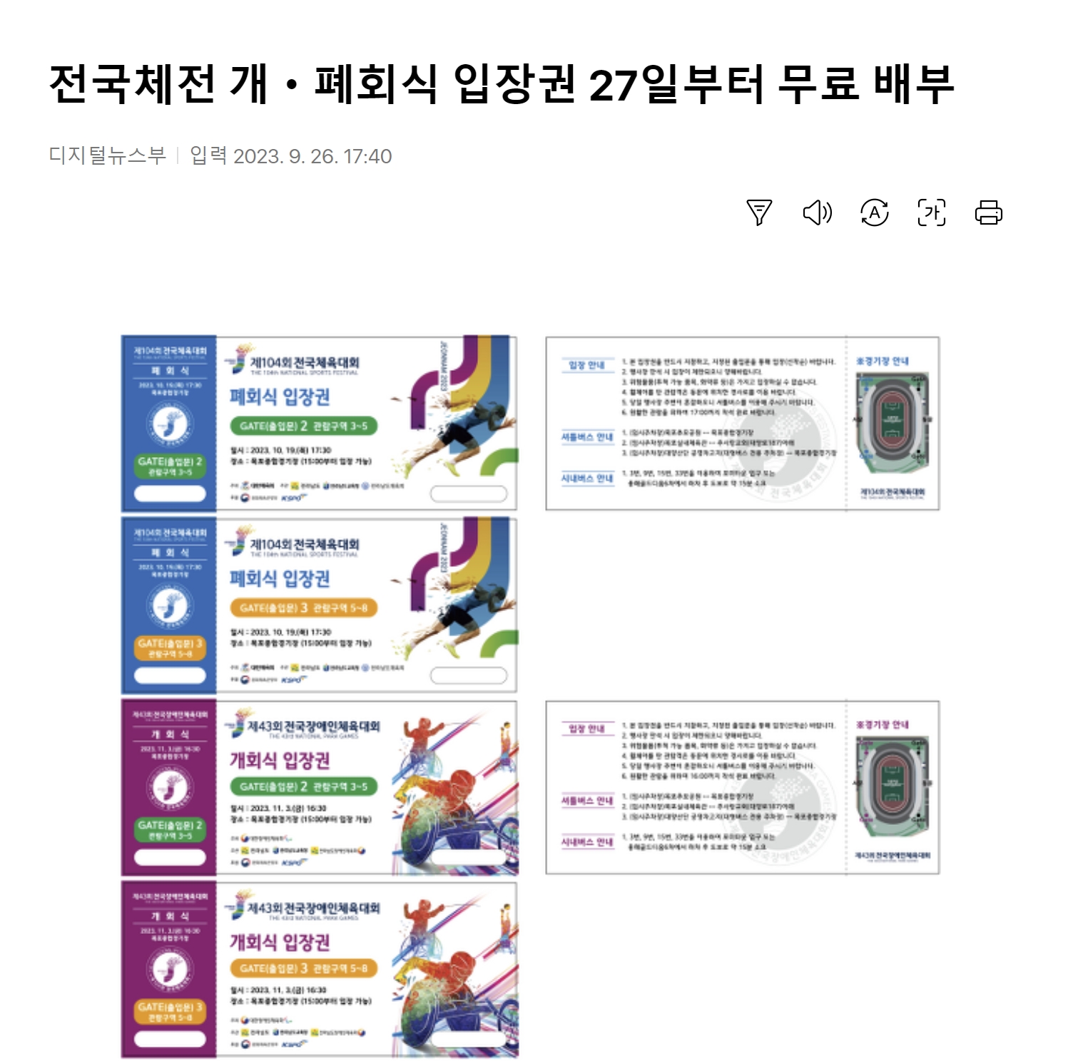 전국체전 개,폐회식 입장권이 무료 배부중입니다