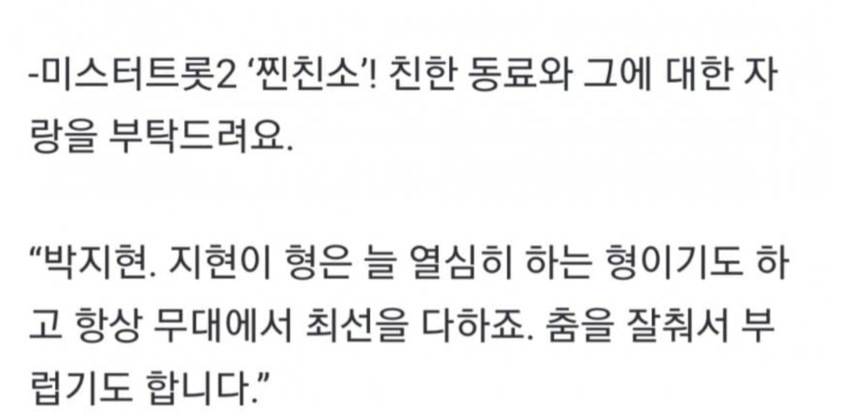 지현님이나 트롯브로들 모두 지금처럼 서로 아껴주고 찐친으로 응원하며 함께하길 기원합니다