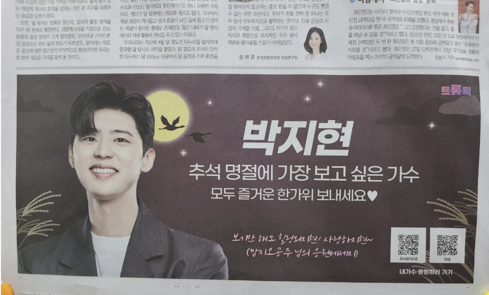 또한 지난번 트롯픽 스페셜에서 진행된 스페셜 투표'추석특집 방송에서 가장 만나고 싶은 스타는?'의 결과 박지현이 1위를 차지해서 동아일보에 광고가 게재됐습니다