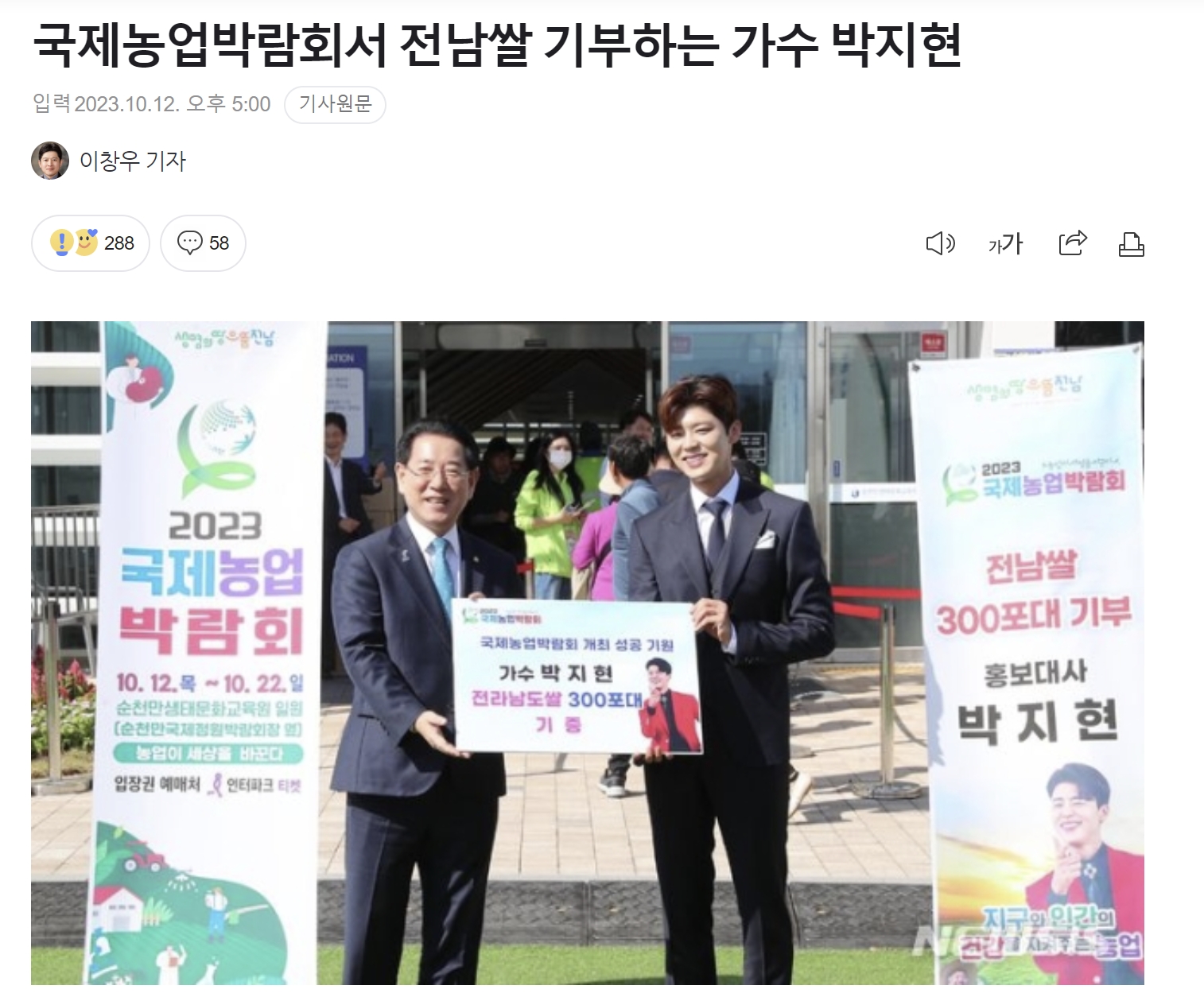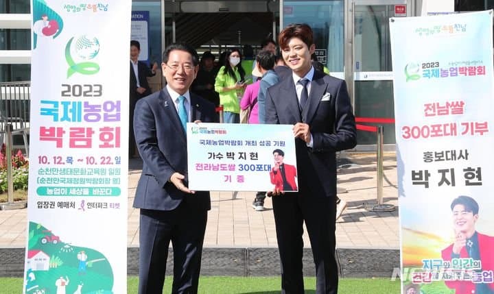 김영록 전남도지사는 2023국제농업박람회 개막식에서 박지현 홍보대사가 전남쌀300포대를 기부했다고 밝혔습니다