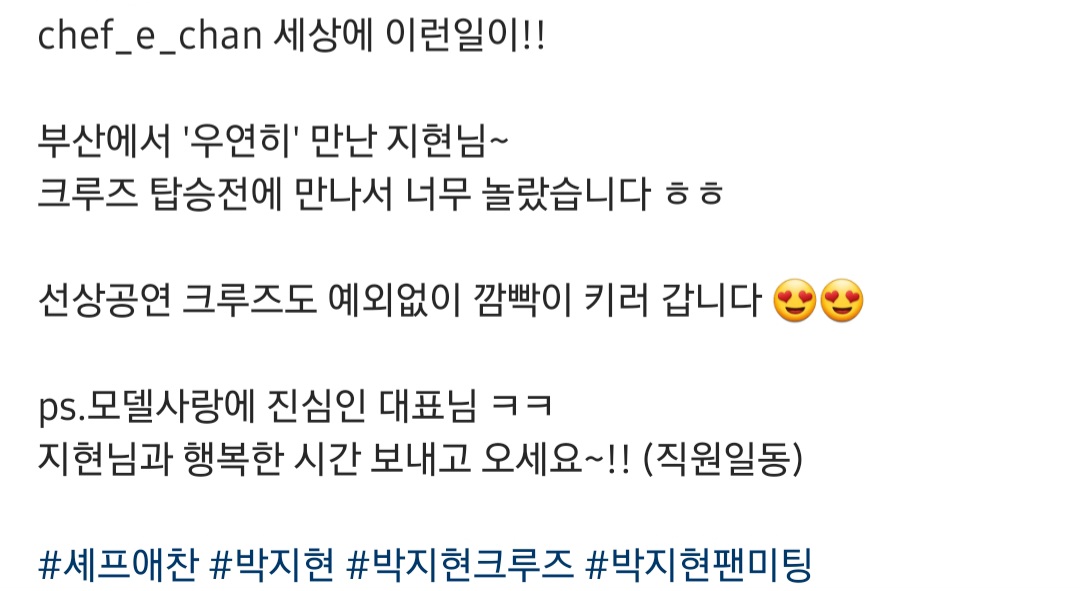 또 셰프애찬에서 19일 오전 크루즈를 탑승하러 간 대표님이 지현님과 우연히 마주쳤다고 인스타에 게시글과 사진을 올려주었습니다