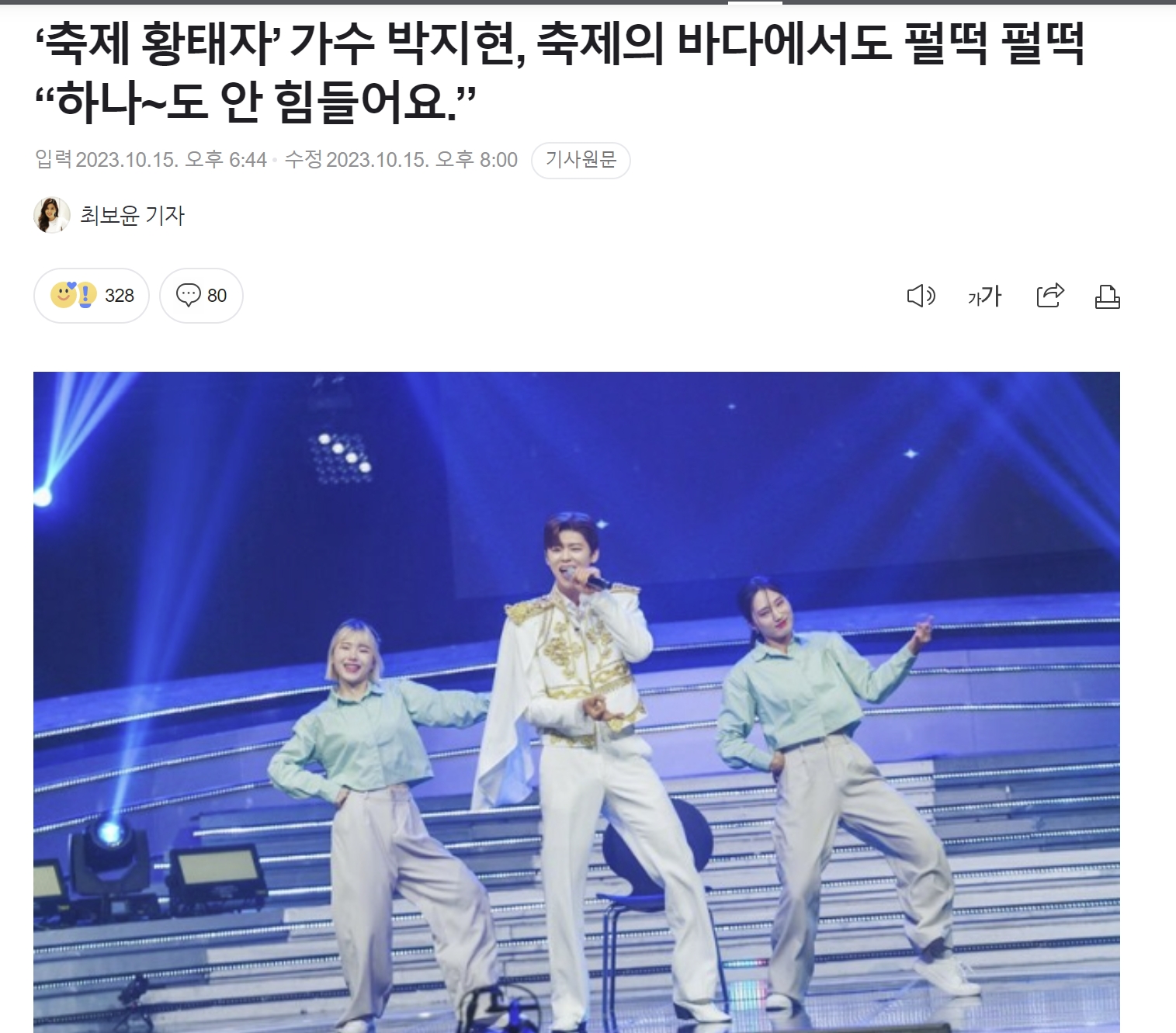 '축제 황태자 가수 박지현 축제의 바다에서도 펄떡 펄떡 하나도 안 힘들어요"란 제목의 기사가 게재됐습니다
