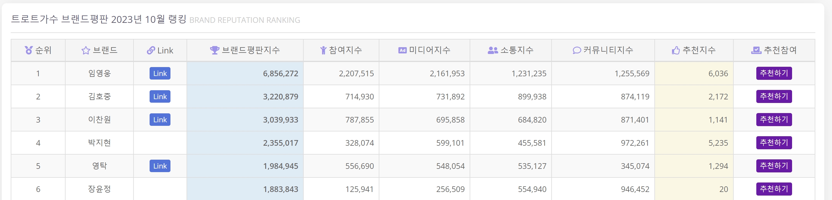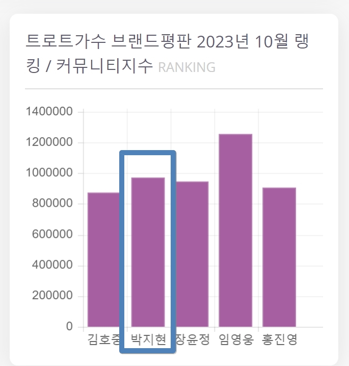 9월달 7위를 기록했던 박지현은 10월달 4위를 차지했으며 커뮤니티 지수와 추천지수가 각각 2위에 오르며 임영웅의 뒤를 이었다는 점이 주목받고 있습니다