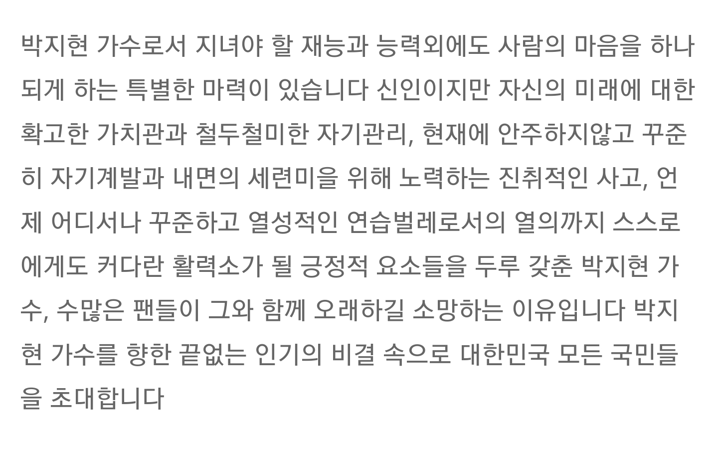 박지현은 가수로서 지녀야 할 재능과 능력외에도 사람의 마음을 하나되게 하는 특별한 마력이 있습니다