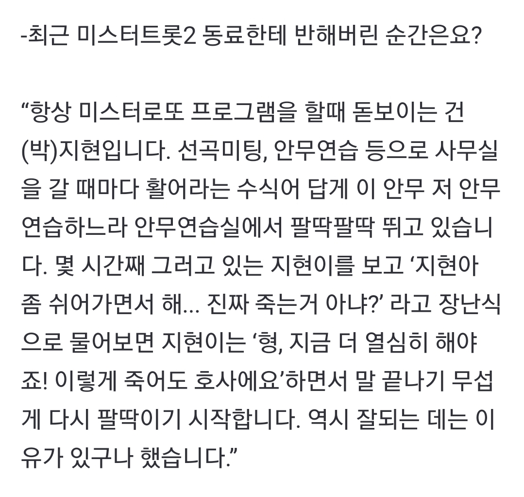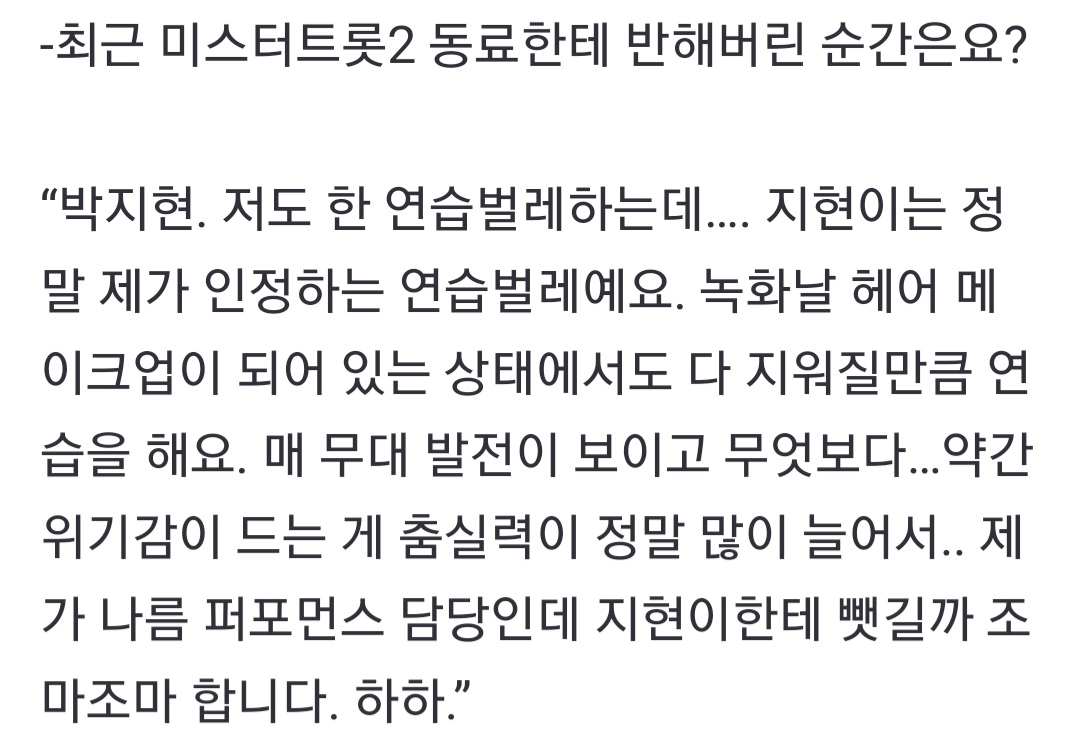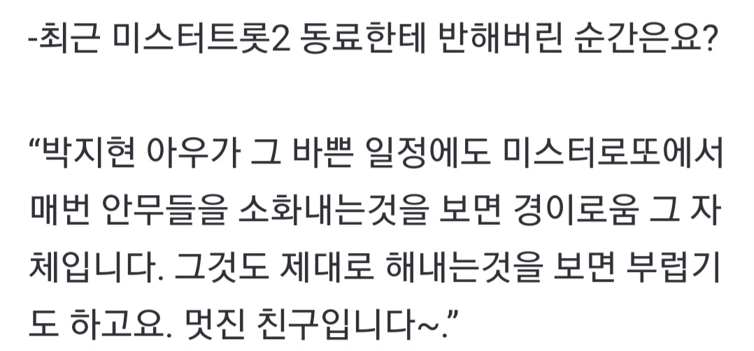 얼마 전 인터뷰에서 '최근 미스터트롯2 동료에게 반해버린 순간은?이란 질문에 박지현에 대해 칭찬을 해준 내용들을 모아봤습니다