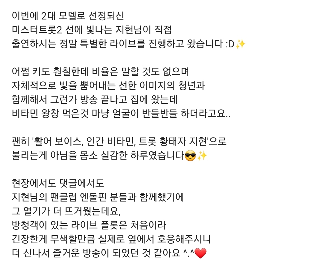 키도 훤칠한데 비율도 좋고 자체적으로 빛을 뿜어내는 선한 이미지의 지현님과 함깨해서 비타민 왕창 먹은것 같았다면서 활어보이스, 인간비타민,트롯황태자 지현으로 불리는 이유를 몸소 실감한 하루였다고 좋은글을 남겨주셨습니다