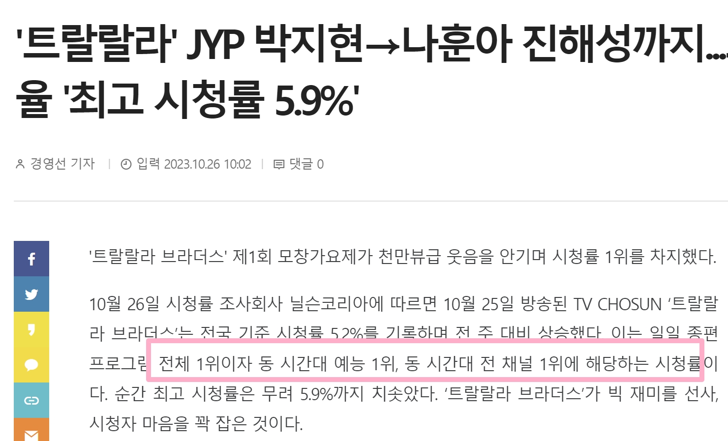 두 번째 주간 주요뉴스는 11월8일 수요일에 방송된 트랄랄라 브라더스 관련 소식입니다