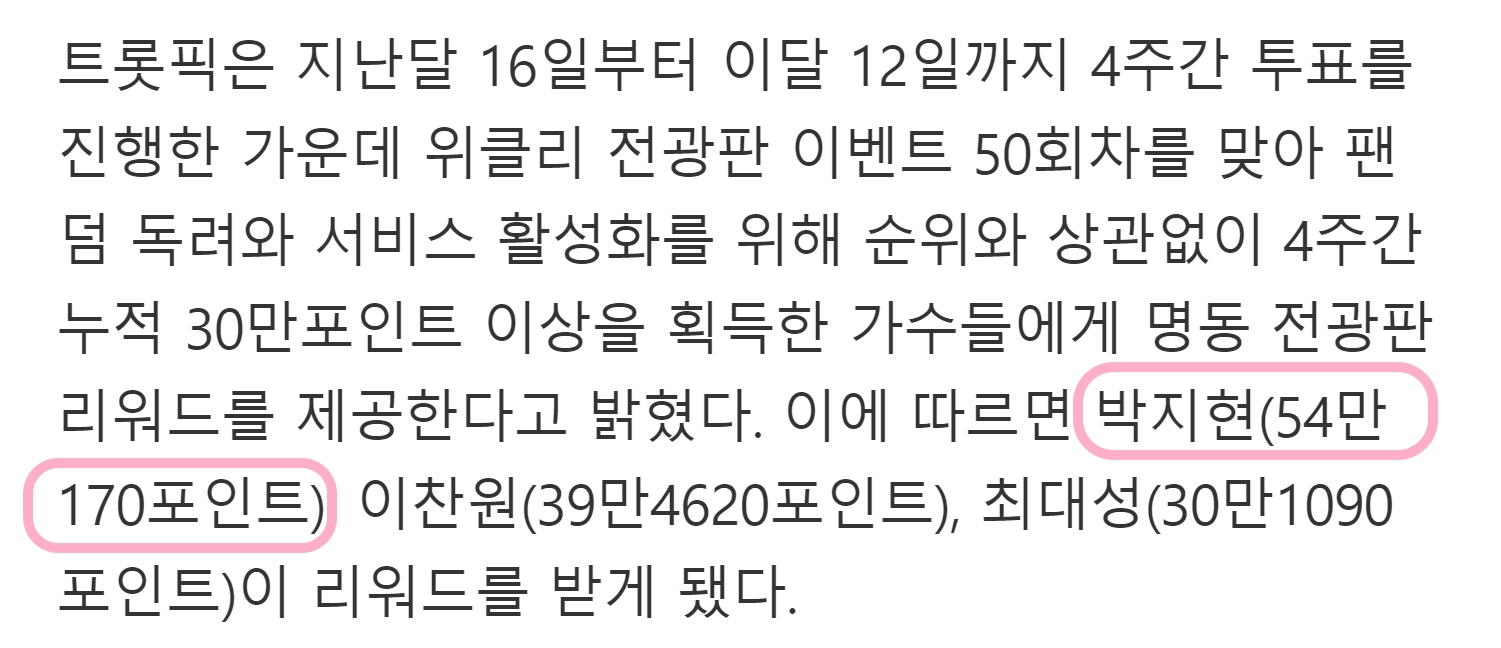 13일 트롯스타 투표 웹서비스 '트롯픽'은 4주간 누적포인트 30만포인트 이상을 획득한 가수들에게 명동 전광판 리워드를 제공한다고 밝혔습니다