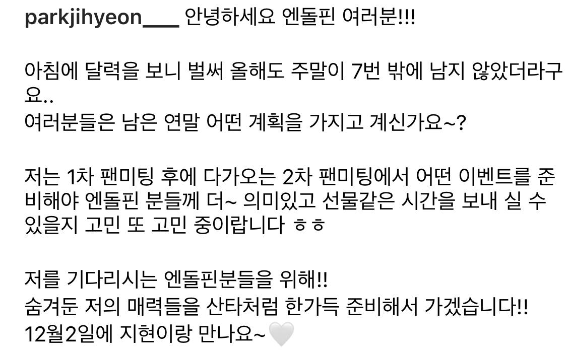 올해도 주말이 7번 밖에 안남았다며 2차팬미팅에서 더 의미있고 선물같은 시간을 보낼 수 있을지 고민중이라며 엔돌핀들을 위해 숨겨둔 매력들을 산타처럼 한가득 준비하겠다며 12월2일 2차팬미팅에서 만나자는 글을 남겨주었습니다