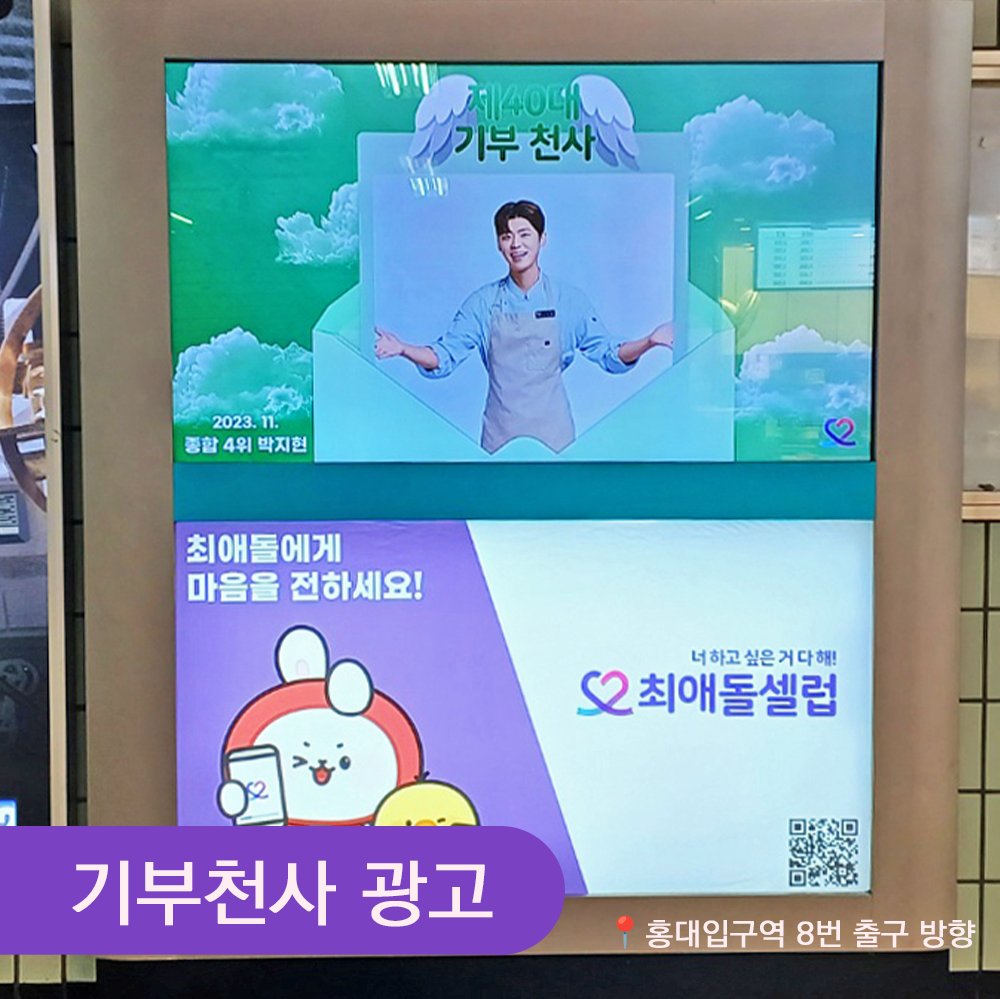 40대 기부천사 보상으로 밀양복지재단에 50만원을 기부하며 2주동안 홍대입구역에 지하철 광고가 송출됩니다
