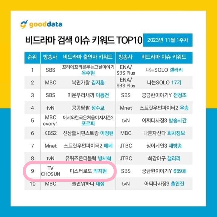 11월1주차 비드라마 검색 이슈 키워드에 미스터 로또 박지현이 9위에 올라서 화제가 되고있습니다