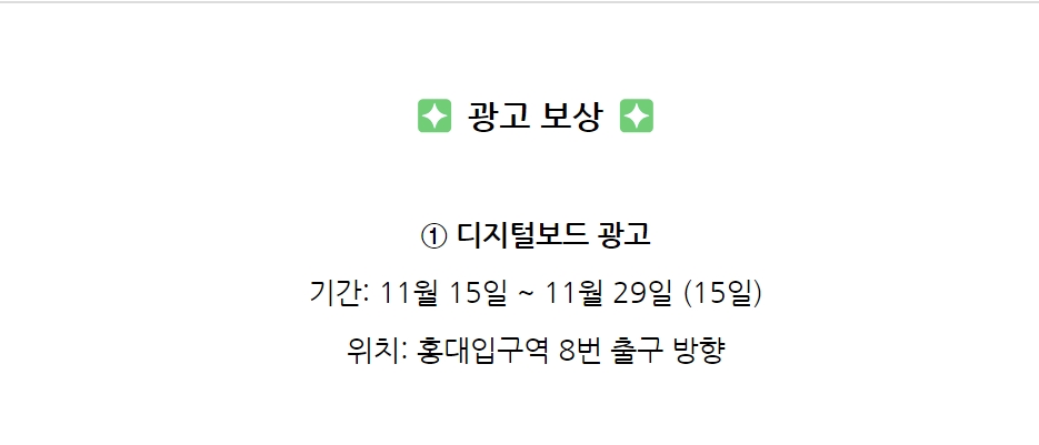 기간은 11월15일부터 11월29일까지 15일간이며 홍대입구역 8번출구 방향입니다