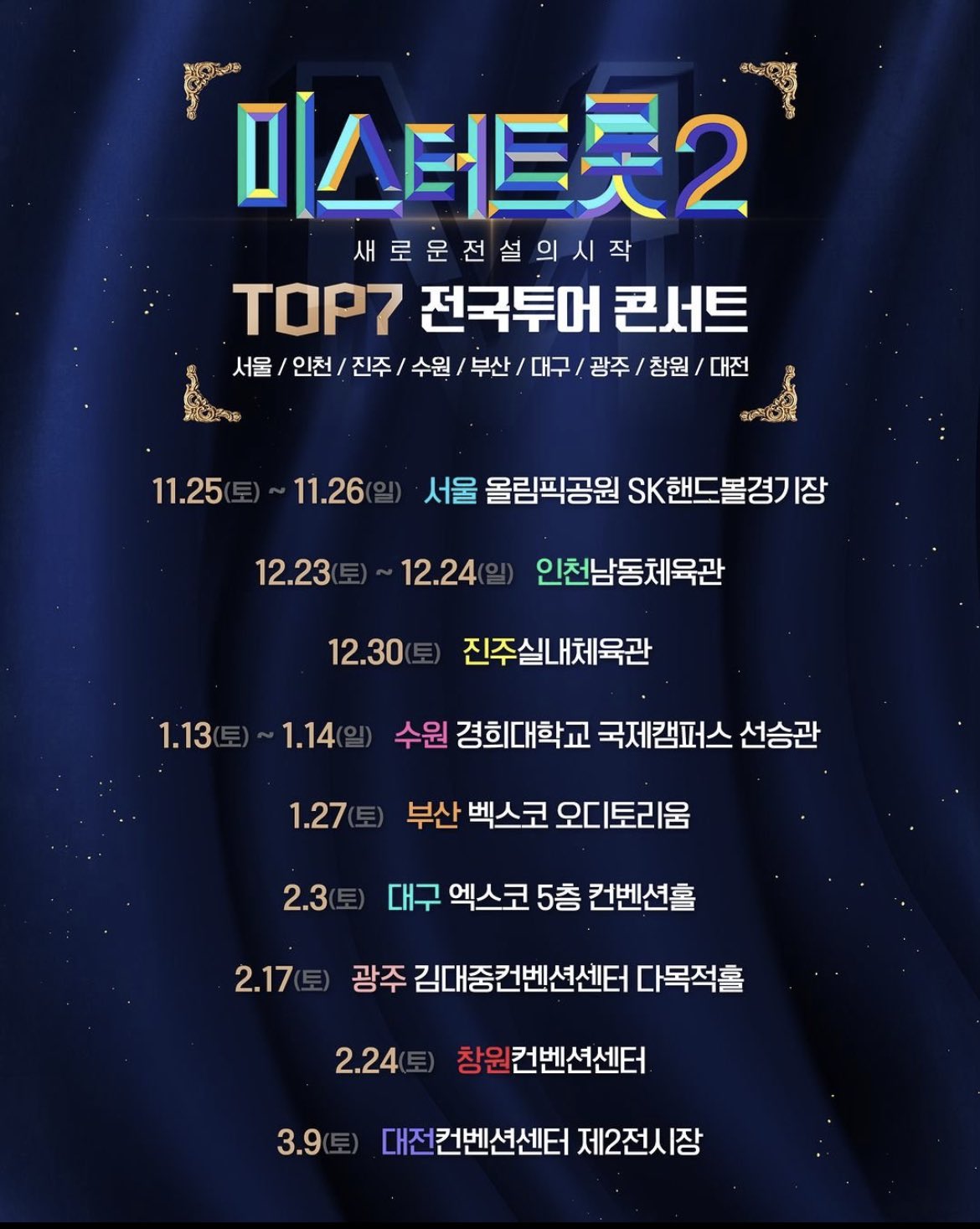 미스터트롯2 TOP7콘서트는 2023년11월25일 토요일~2024년 3월9일 토요일까지 개최되며 공연지역은 서울,인천,진주,수원,부산,대구,광주,창원,대전입니다