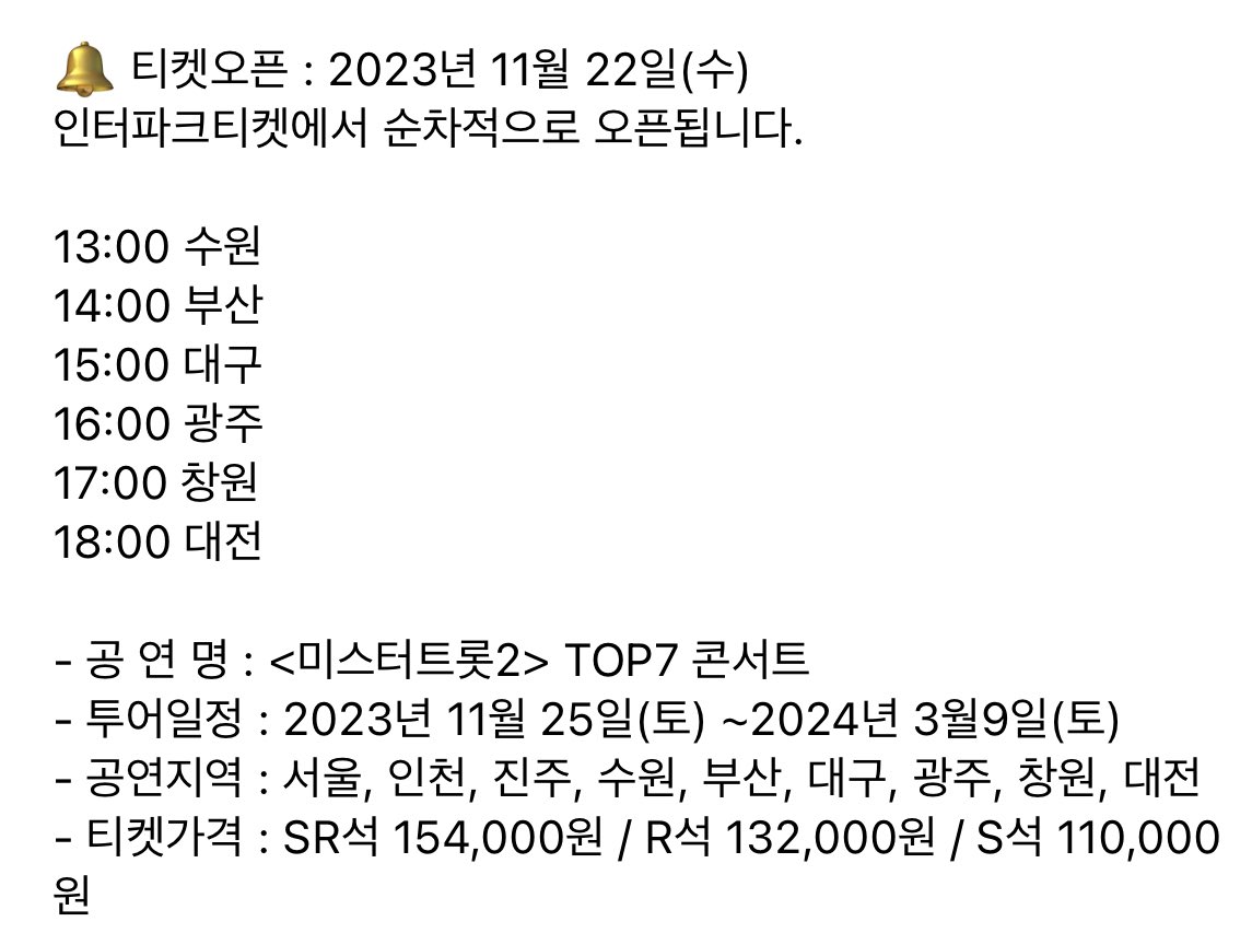 티켓은 23년11월22일 수요일에 인터파크티켓에서 순차적으로 오픈됩니다