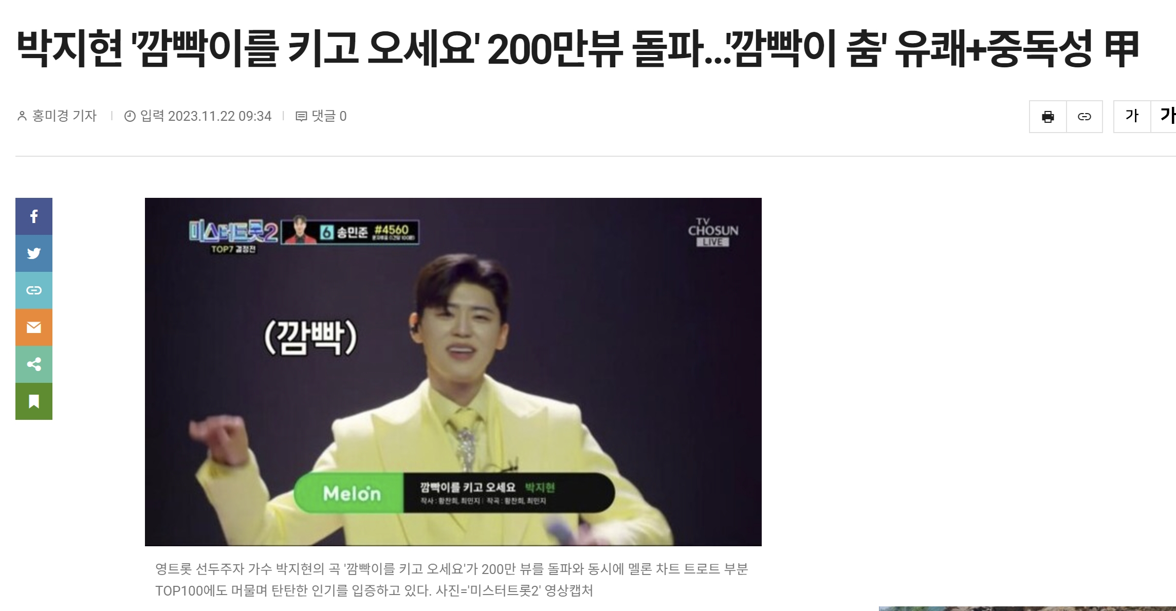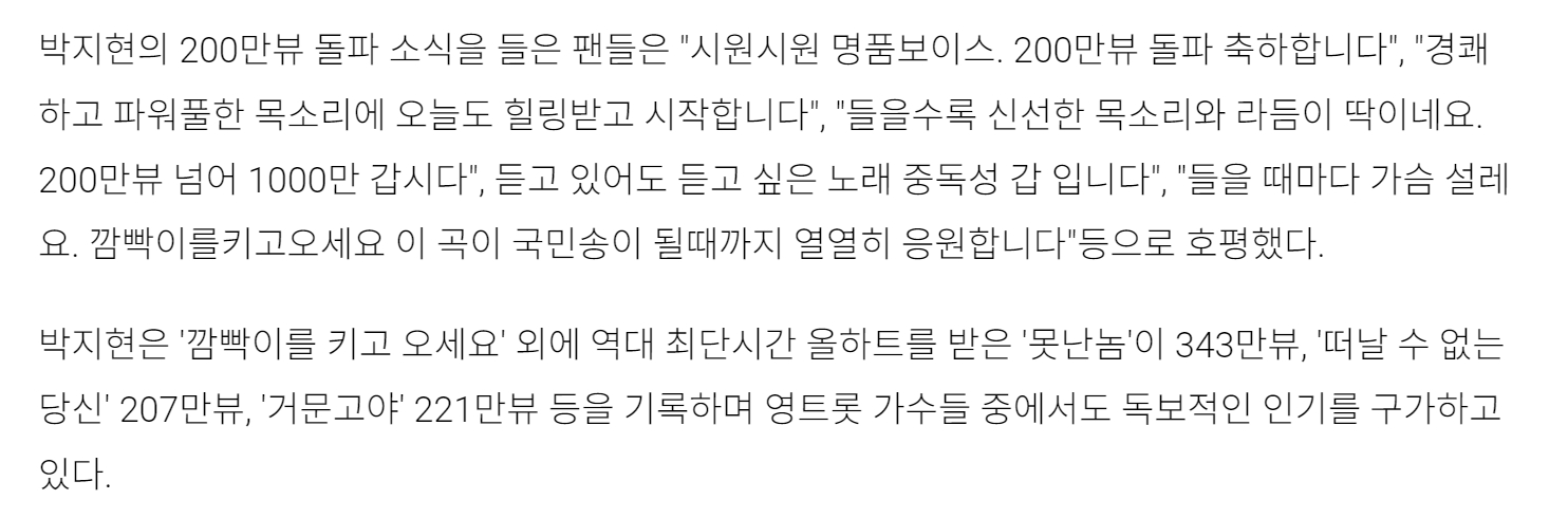 박지현의 '깜빡이를 키고 오세요'가 200만뷰를 돌파했다는 기사가 게재됐습니다