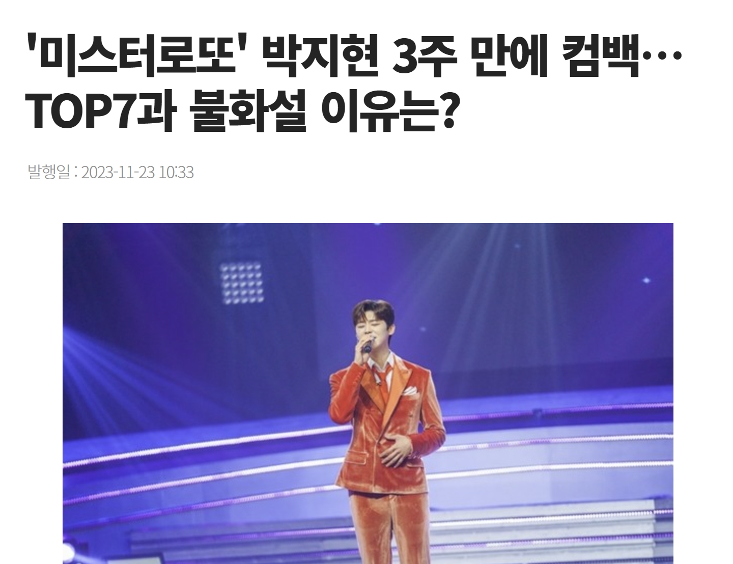 '미스터 로또 박지현 3주만에 컴백'TOP7과 불화설 이유는?이란 제목의 기사가 게재됐습니다