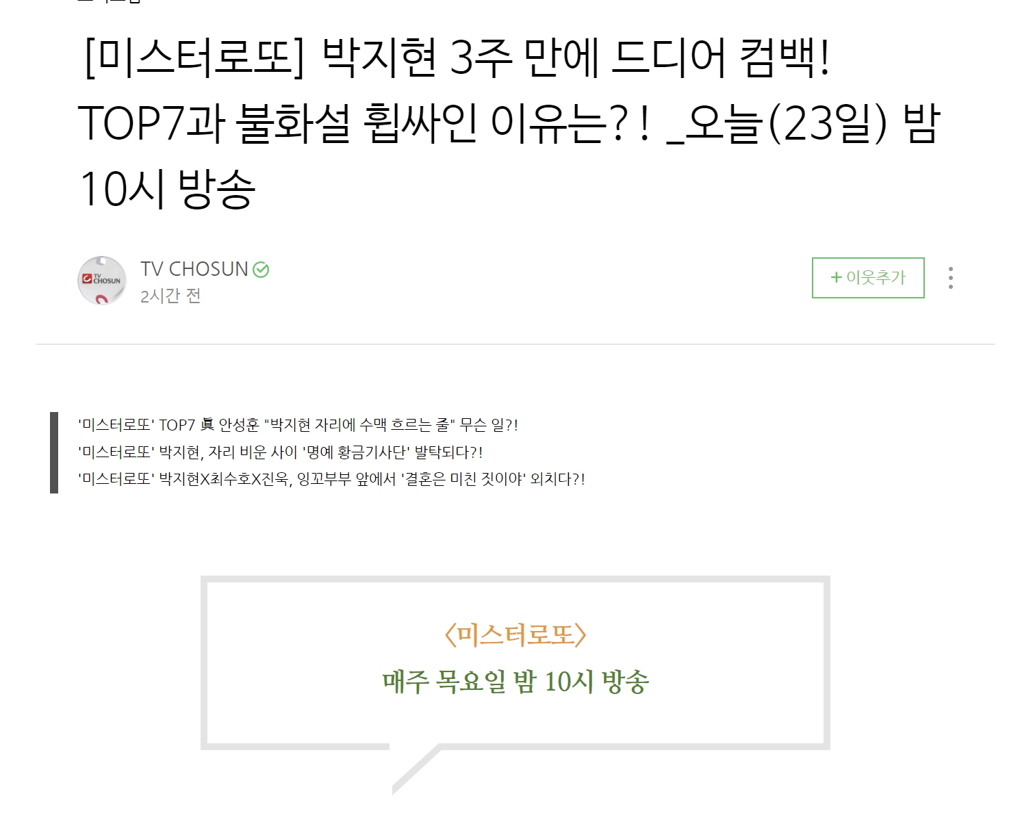'미스터 로또 박지현 3주만에 컴백'TOP7과 불화설 이유는?이란 제목의 기사가 게재됐습니다