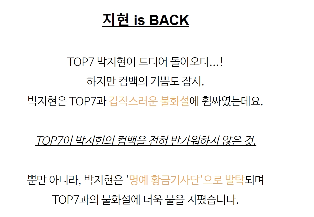 박지현이 드디어 돌아왔지만 컴백의 기쁨도 잠시 TOP7과 갑작스런 불화설에 휩싸였다고 하는데요
