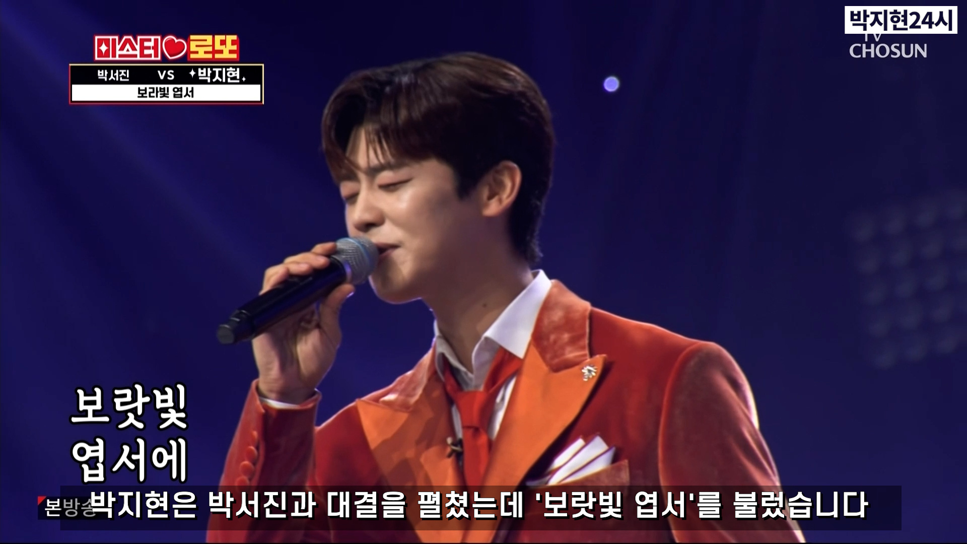 박지현은 박서진과 대결을 펼쳤는데 '보랏빛 엽서'를 불렀습니다
