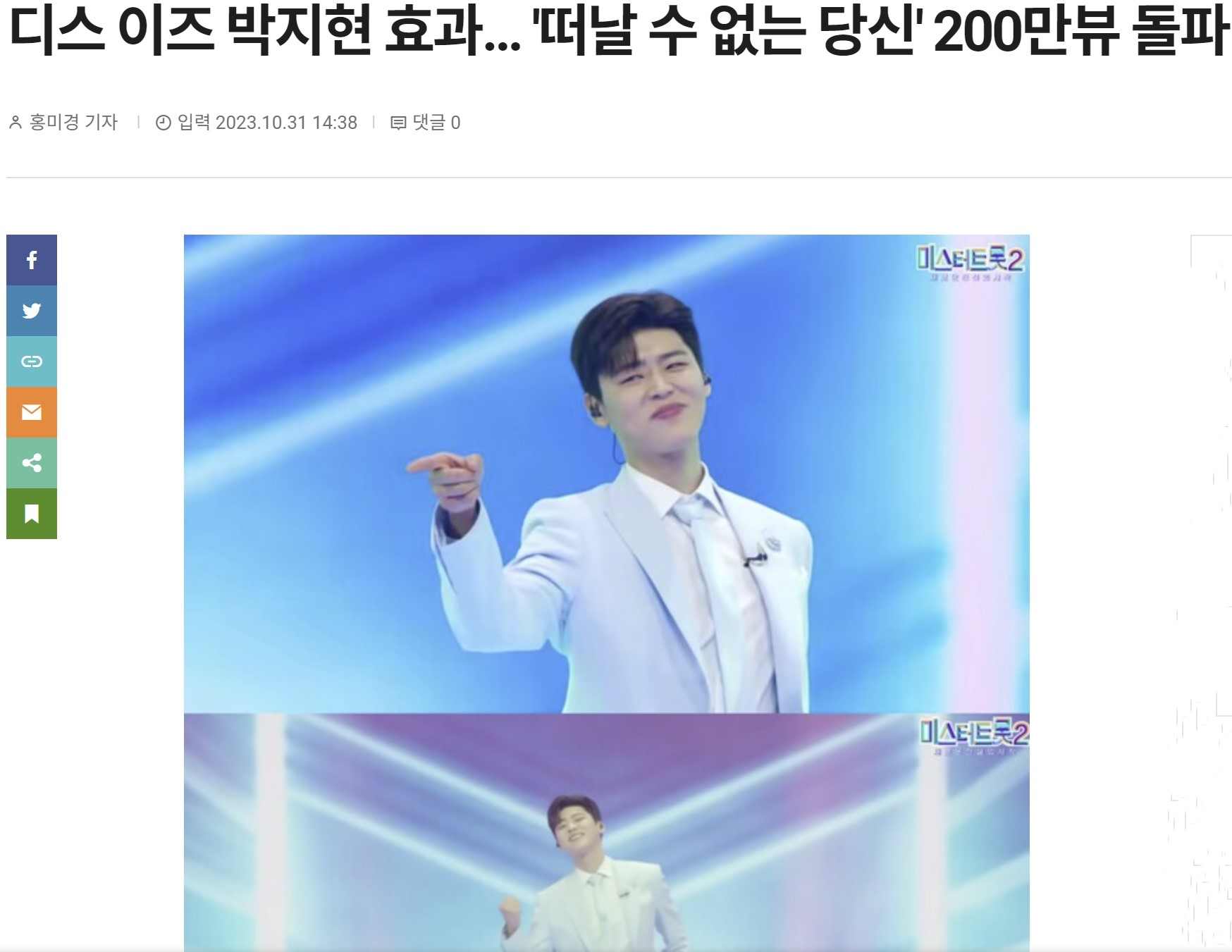 디스 이즈 박지현 효과 '떠날 수 없는 당신'200만뷰 돌파 기사가 게재됐습니다