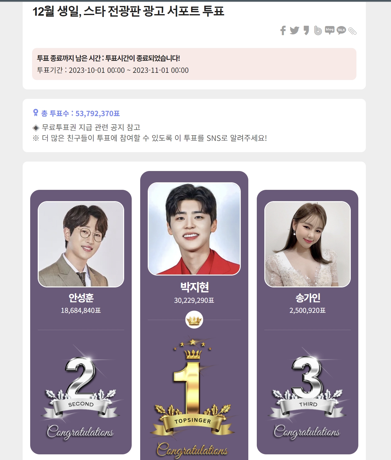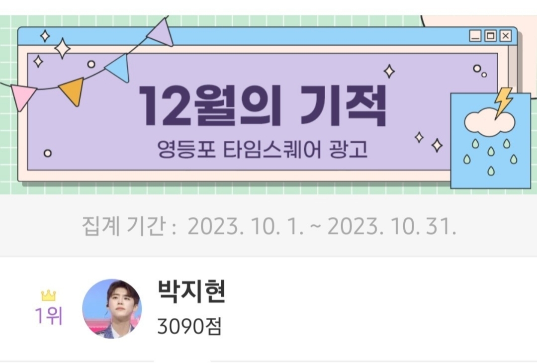 톱스타뉴스에서 주관하는 10월1일부터 11월1일 0시까지 진행된 12월 생일 스타 전광판 광고 서포트 투표 결과 박지현이 1위를 차지했습니다
