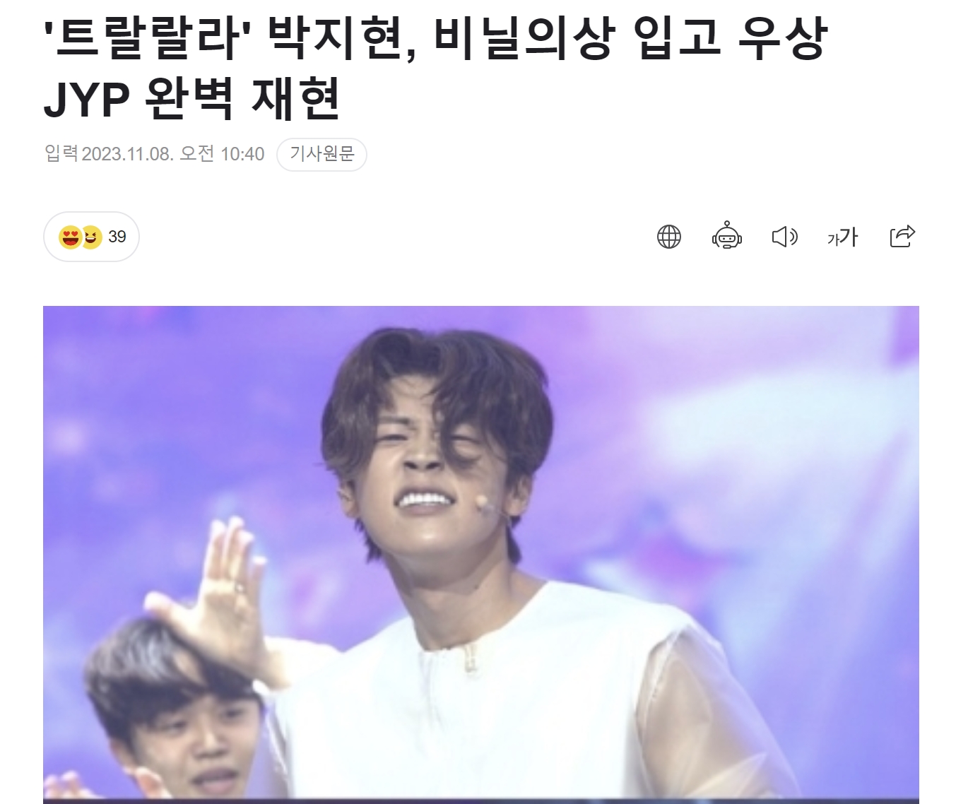 특히 쉴새없는 댄스에도 흔들림 없는 완벽한 라이브 실력까지 과시하며 감탄을 자아낸 박지현의 jyp변신이 더욱 기대된다는 기사입니다