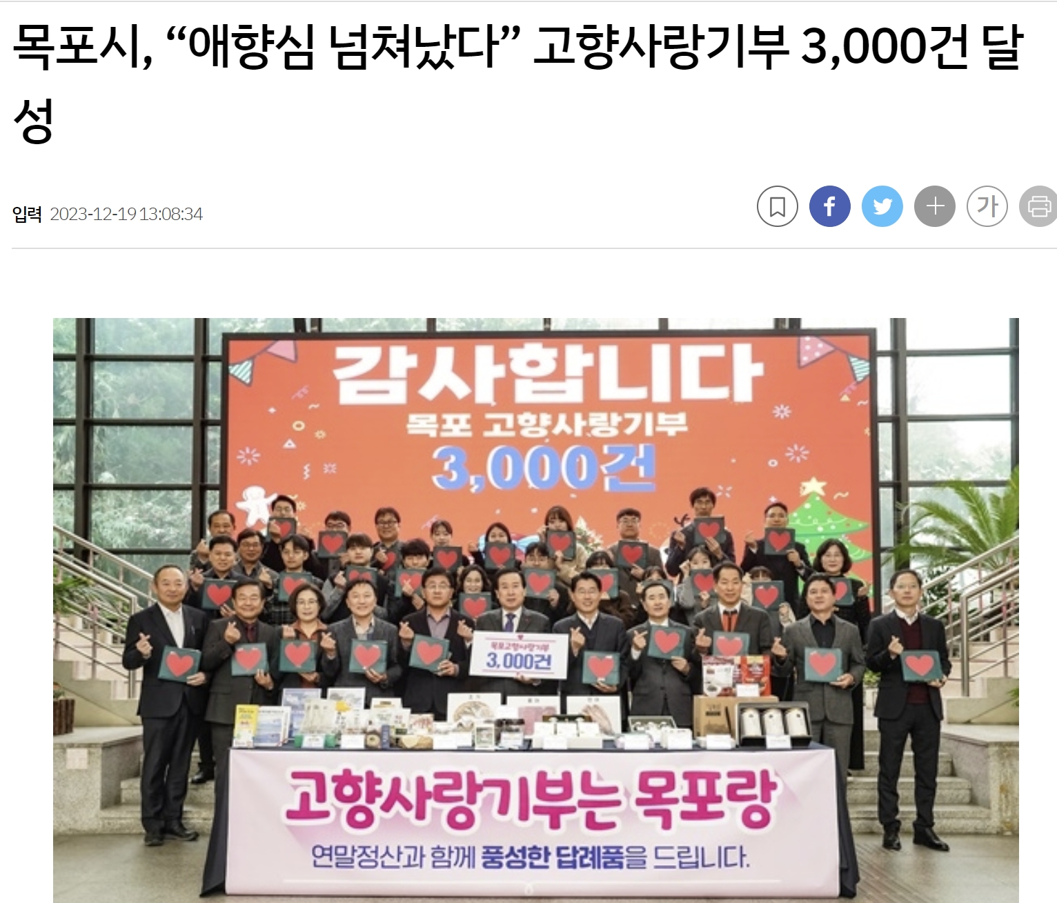 목포시에서 고향사랑 기부가 3000건 달성 성과를 감사하는 기사가 게재됐습니다