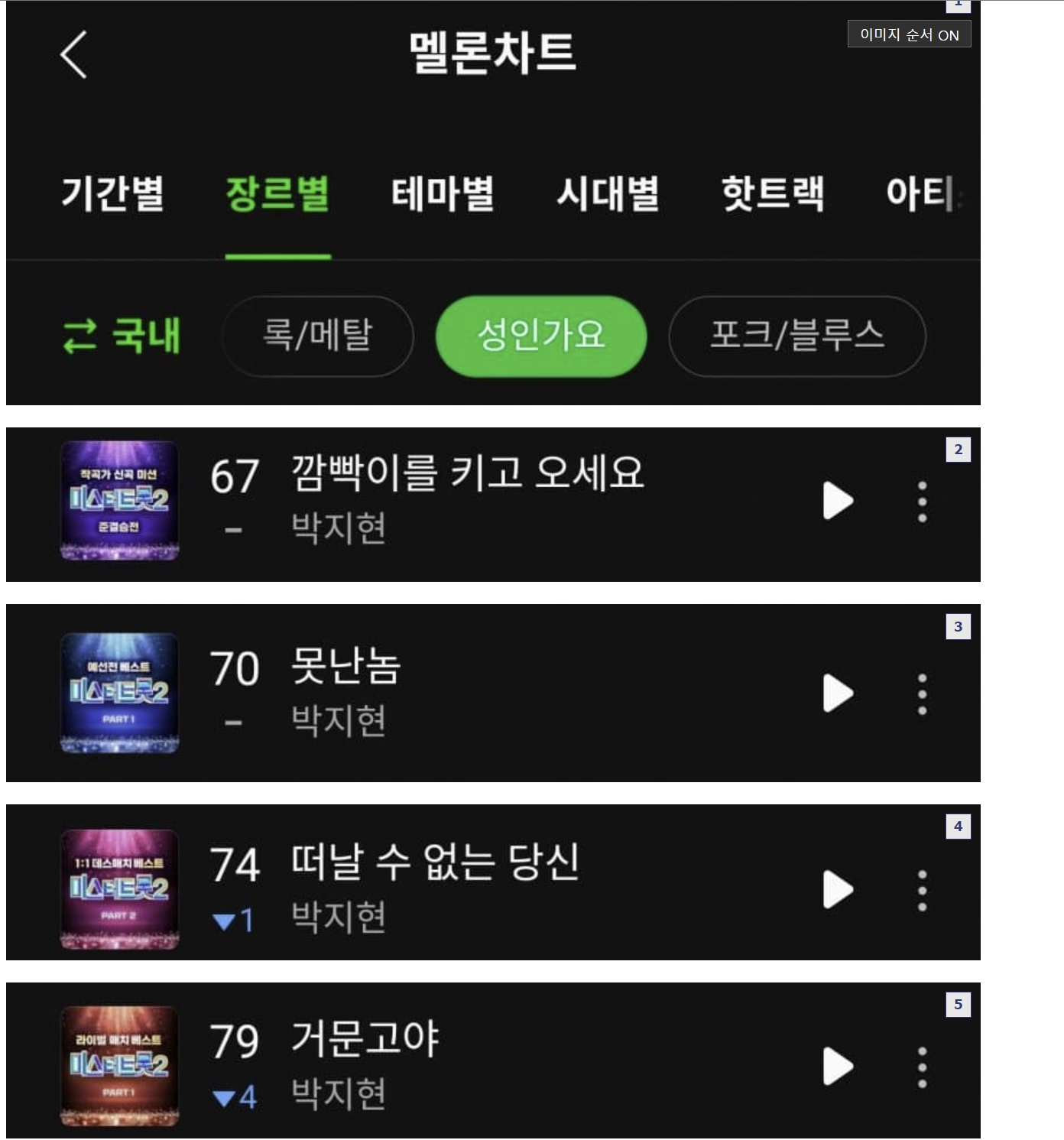 박지현이 국내 최대 음악 플랫폼인 멜론 성인가요 차트에서 전주 대비 상승한 가운데 올해 꾸준히 top100에 차트인 되고 있습니다