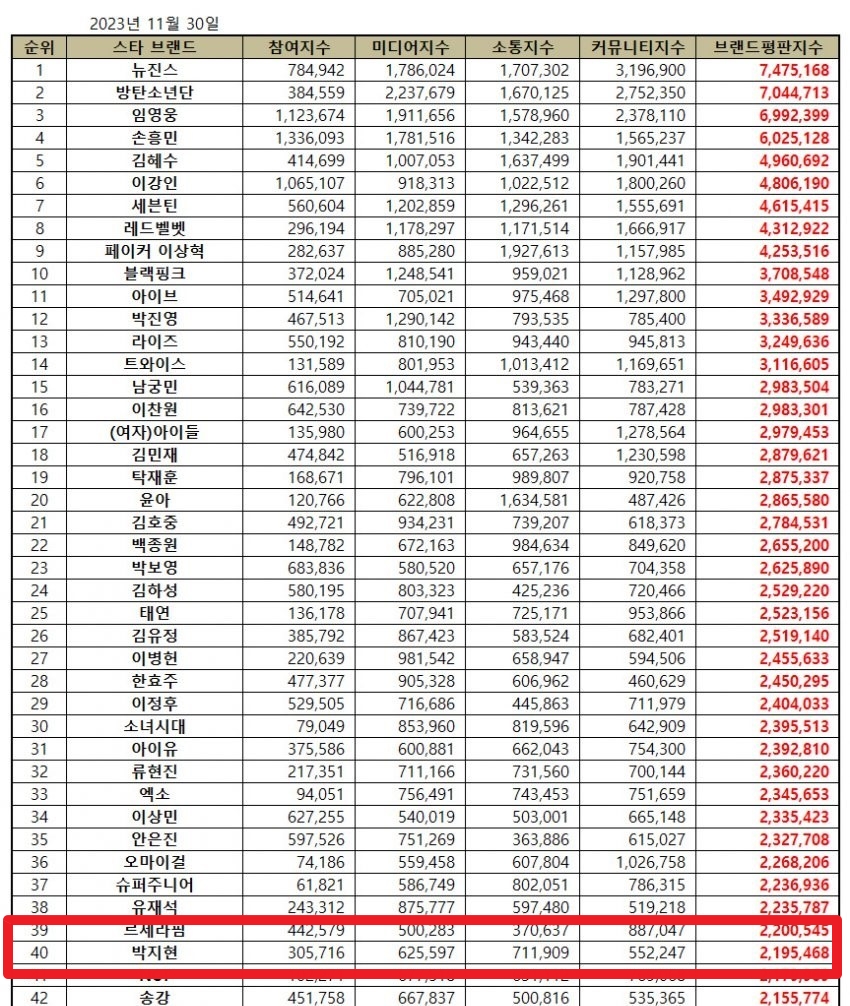 11월 스타 브랜드 평판 결과 박지현이 10월달에 대비 5계단 상승했으며 (45위에서 40위로 5계단 상승)10대 가수상을 수상하며 대세 스타로서 입지를 다졌습니다