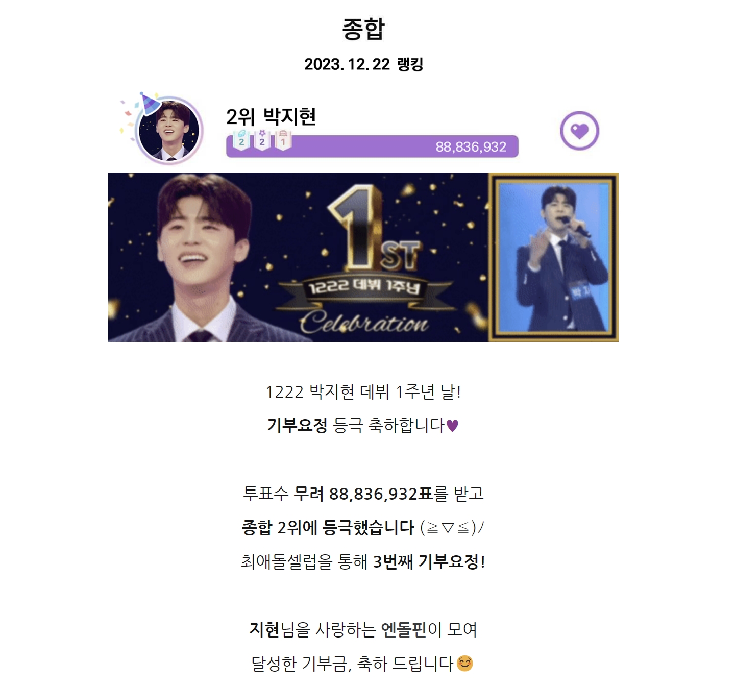 엔돌핀의 뜨거운 화력으로 최애돌셀럽 제100대 기부요정에 전성된 박지현님은 투표수 88,836,932표를 받으며 종합 2위에 등급했습니다