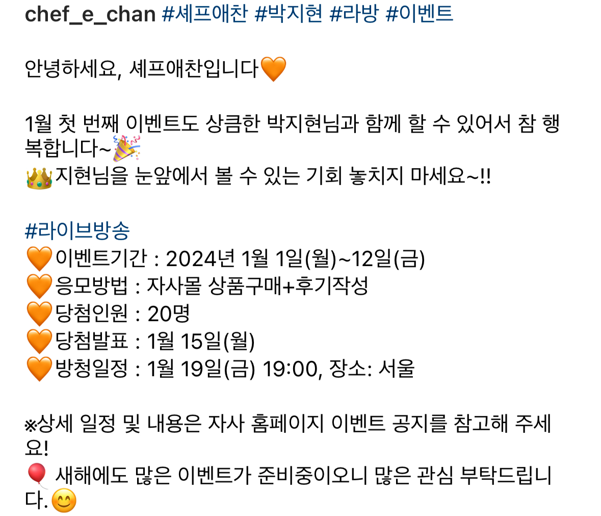 2024년1월1일부터 12일까지 셰프애찬몰에서 상품구매와 후기작성을 한 분주 20명을 추첨해서 1월15일에 당첨자를 발표합니다