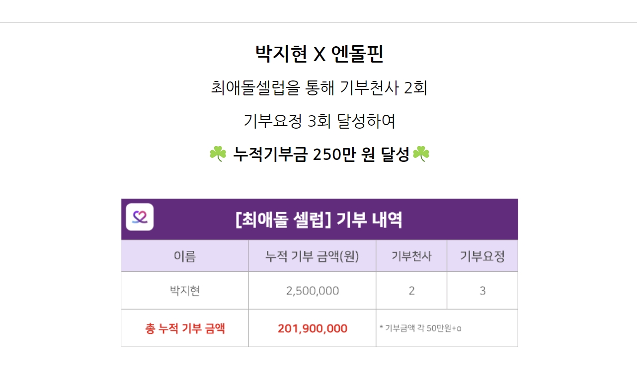 100대 기부요정으로 선정된 박지현의 이름으로 밀알복지재단에 기부를 했으며 박지현님은 최애돌 셀럽을 통해 기부천사 2회 기부요정 3회달성으로 누적기부금은 250만원을 달성했습니다