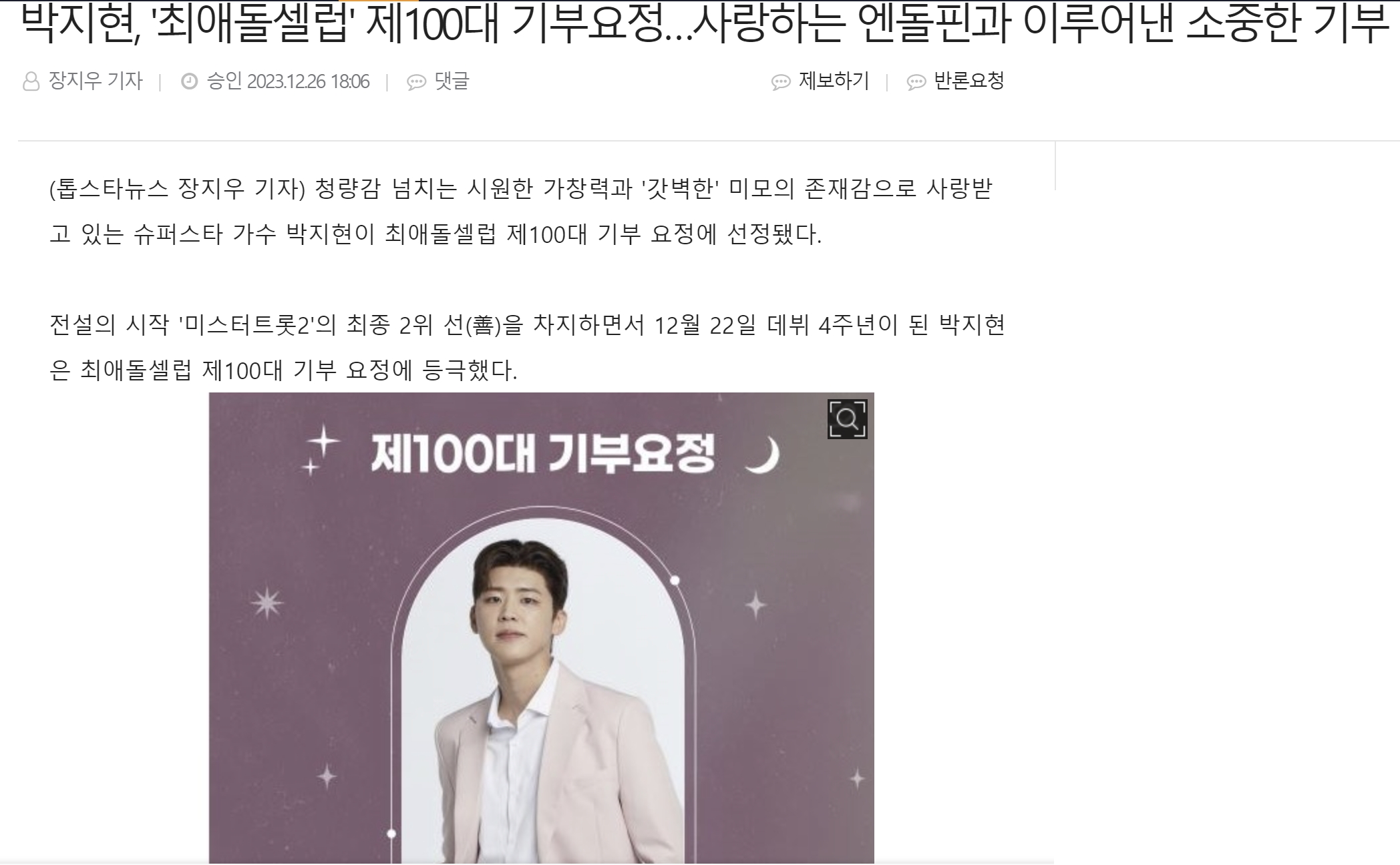 '박지현, 최애돌셀럽 100대 기부요정..사랑하는 엔돌핀과 이루어낸 소중한 기부'라는 제목으로 기사가 게재됐습니다