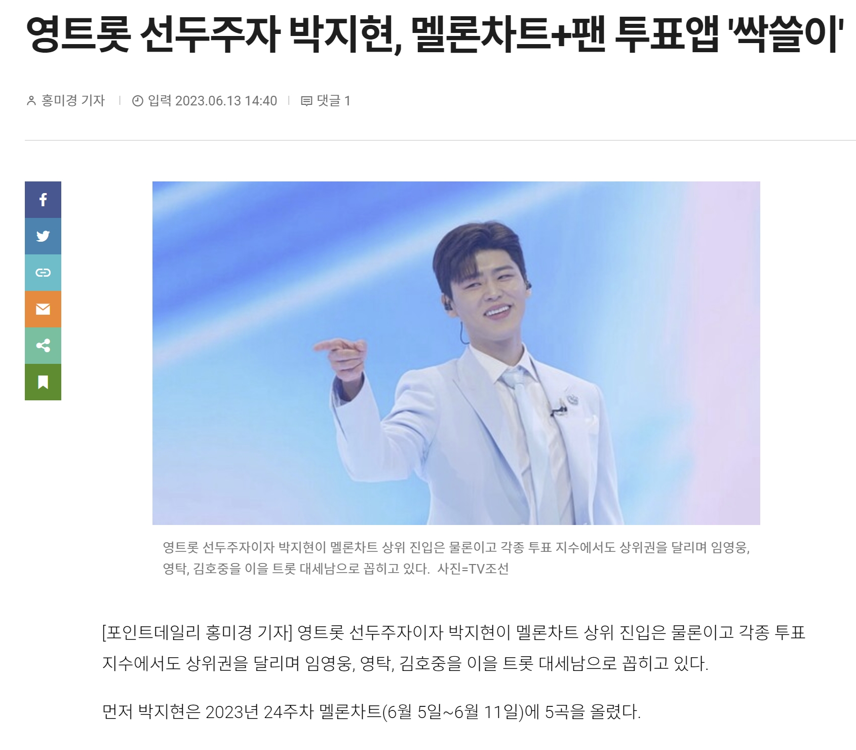 영트롯 선두주자 박지현, 멜론차트와 팬 투표앱 싹쓸이란 제목으로 기사가 올라왔습니다