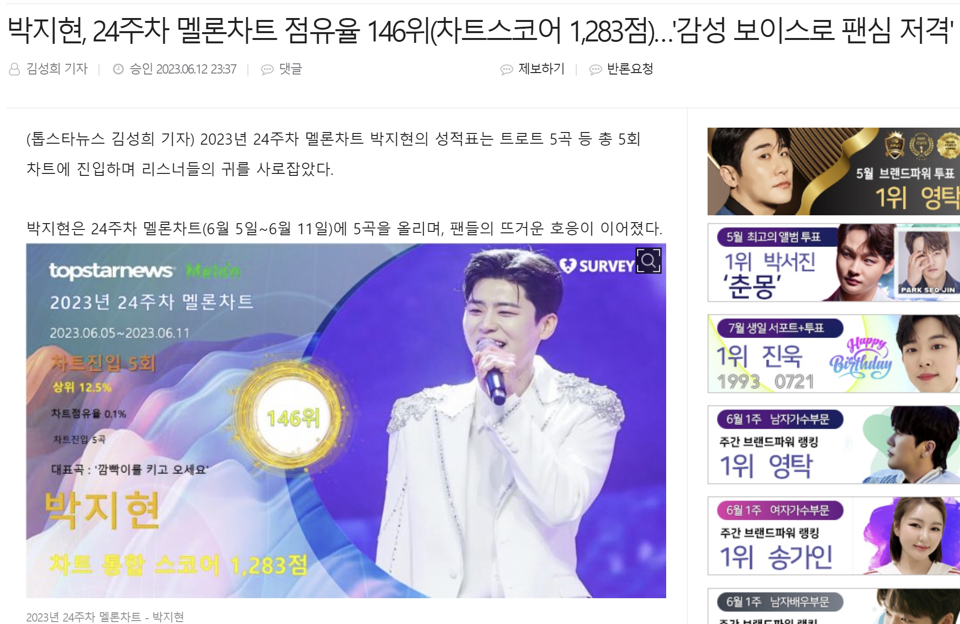 박지현의 멜론차트에 5곡을 올려 점유율146위라는 소식과 어제 전해드린 일룸소파 광고가 가장 어울리는 스타1위에 뽑힌것, 트롯픽 위클리 (6월5일~6월11일)까지 투표에서 4위를 차지한것, 선한 스타 가왕전에서 상금을 받아 기부한것등을 소개하며 박지현이 트롯대세남으로 등극했다는 기사입니다