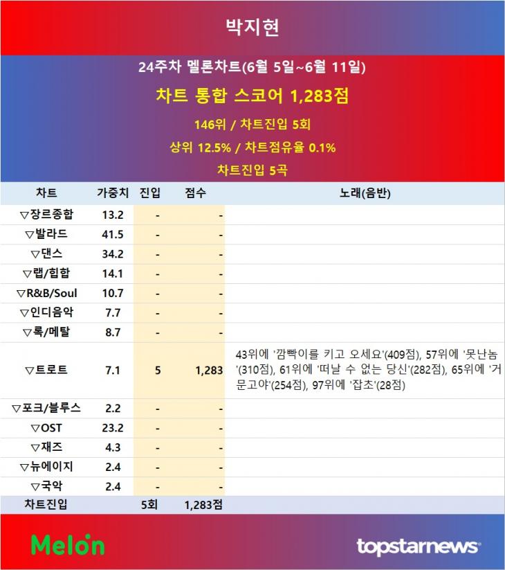 박지현이 24주차 (6월5일~6월11일)멜론차트 점유율 146위(차트스코어1283점)을 달성했습니다