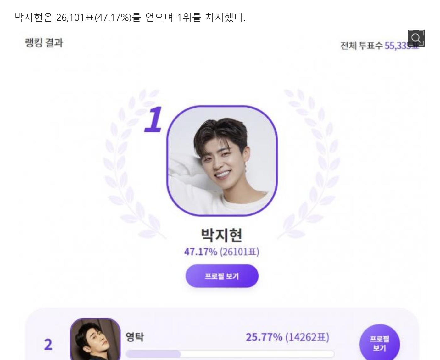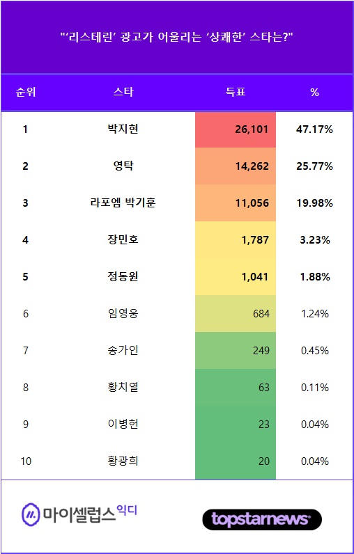 박지현이 마이셀럽스가 운영하는 익디 투표 <리스테린>광고가 어울리는 상쾌한 스타 조사에서 2.6101표 47.17%로 1위를 차지했습니다