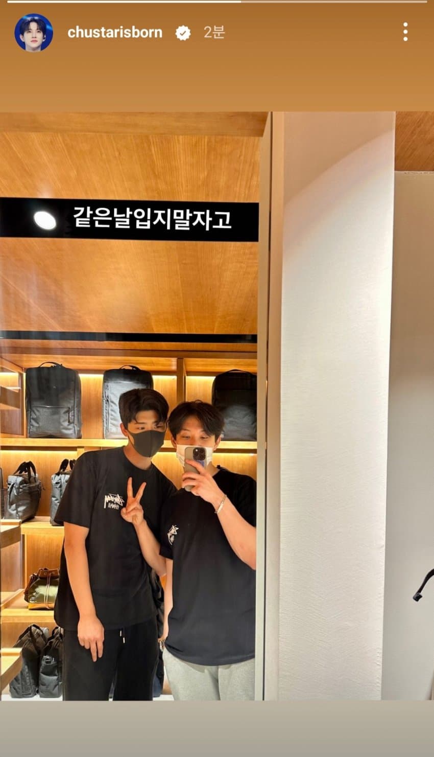 두 사람이 함께 쇼핑을 한 것 처럼 보였고 같은 옷을 입고 함께 사진을 찍었는데 마스크속에도 멋진 박지현의 외모가 돋보였습니다