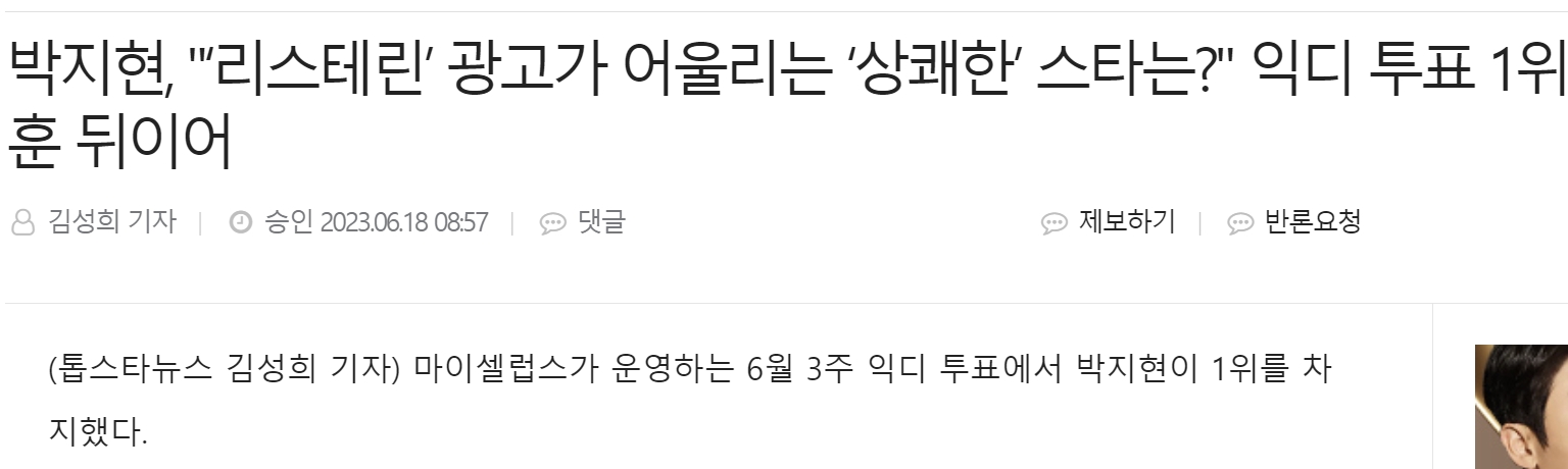 박지현이 마이셀럽스가 운영하는 익디 투표 <리스테린>광고가 어울리는 상쾌한 스타 조사에서 2.6101표 47.17%로 1위를 차지했습니다