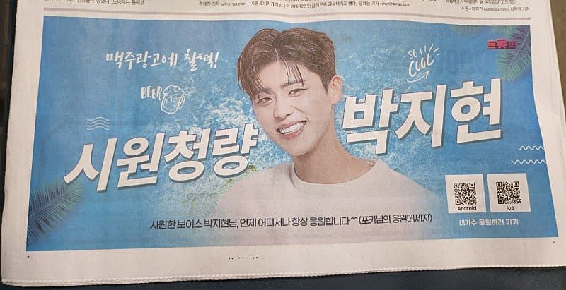 월30일 동아일보에 박지현의 사진과 함께 맥주광고에 찰떡! 시원청량이란 멋진 문구와 팬분의 응원메세지와 함께 박지현의 청량한 사진이 신문에 게재되었습니다