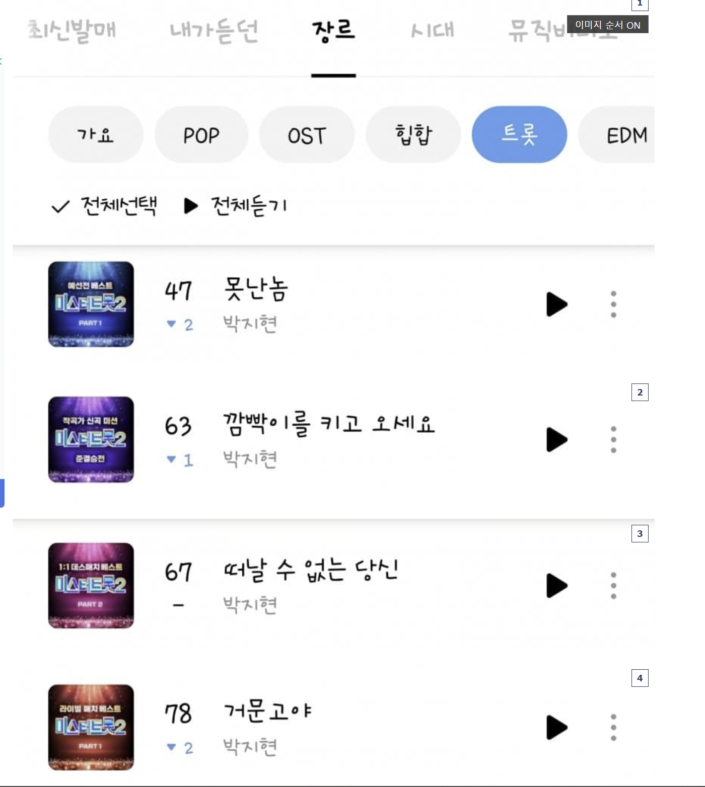 이외에도 6위 "꽃길' , 25위 '못난놈', 51위 '떠날 수 없는 당신', 56위'거문고야' 74위 '팔자', 89위 '인연'입니다
