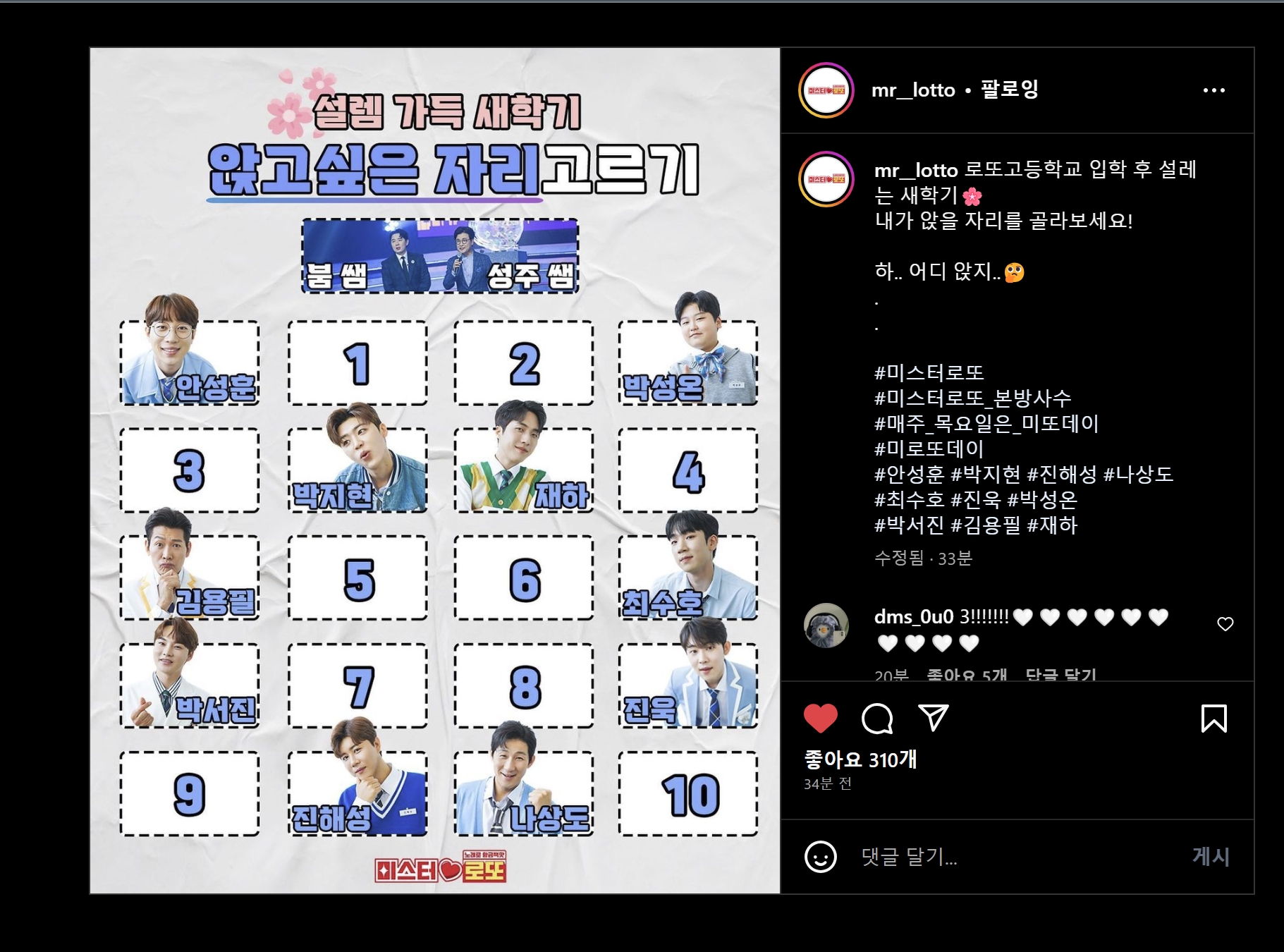 로또 고등학교 입학 후 앉고 싶은 자리 고르기란 제목으로 탑7멤버들 자리가 배치돼있는 사진을 올려주었습니다!